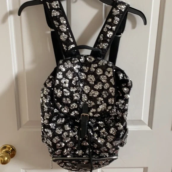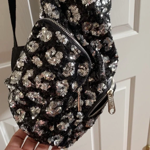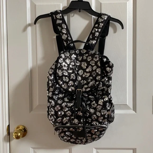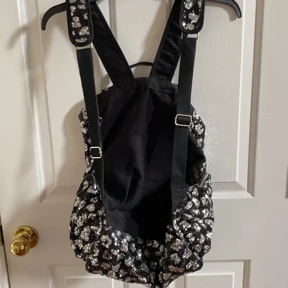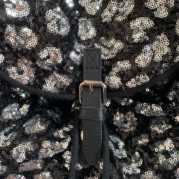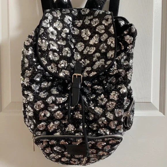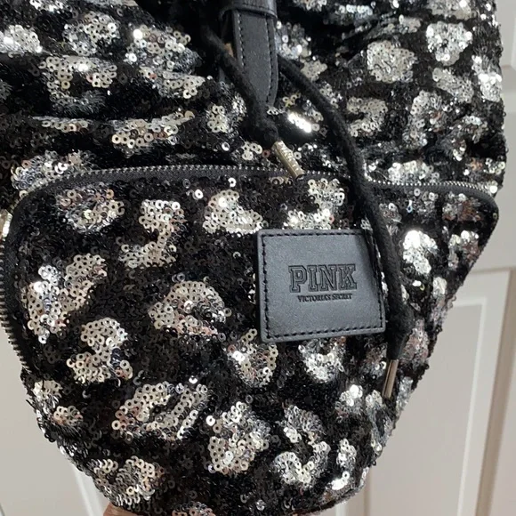 Like new!Only carried one time.Limited edition/ hard to find sequin backpack with cheetah print Front zip pocket 2 side zip pockets Black PINK LOGO patch on pocket Drawstring closure with magnetic flapFold over flap has black buckle Adjustable shoulder straps