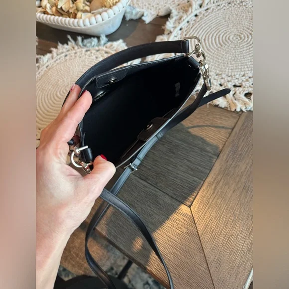 NWOT8.12"h x 7.87"w x 4.37"dhandle drop: 6"strap drop: 19"textured pvcmetal pinmount logounlinedinterior back slip pocketexterior back slip pocketmagnetic snap closure...