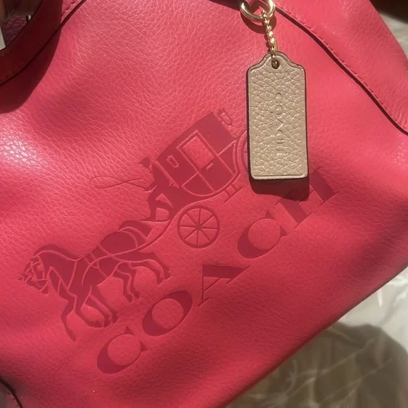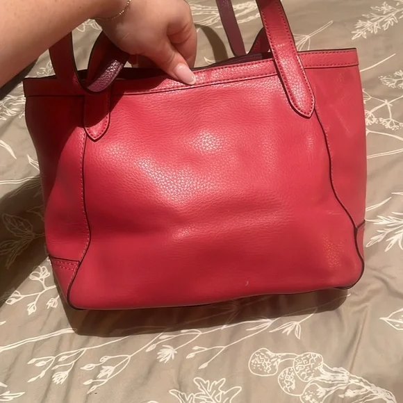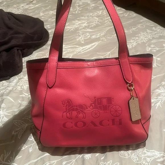 Coach pink leather tote bag. Only used a couple times still in great condition. There is a very small scuff on the back of the purse as shown in pictures. Other than that leather and straps are still in great condition.