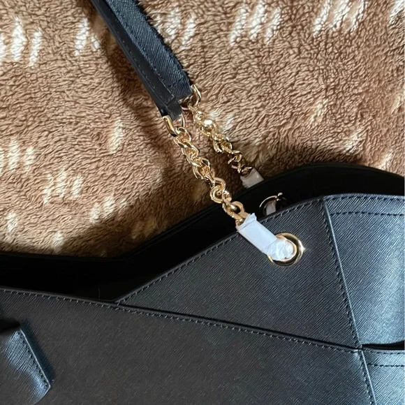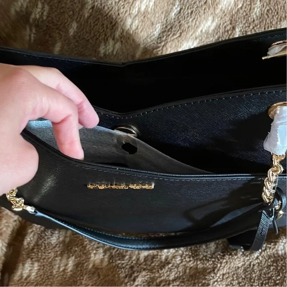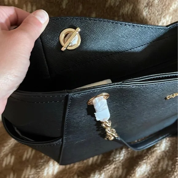 NEW WITH TAGSSide pockets Zipper closureLarge inside shoulder bagBlack color89.4% coated canvas/9.6% polyester/1% polyurethaneGold-tone hardware15.6”W X 11”H X 5.5”D Handle drop: 10"Exterior details: front slip pocketLining: 100% polyester