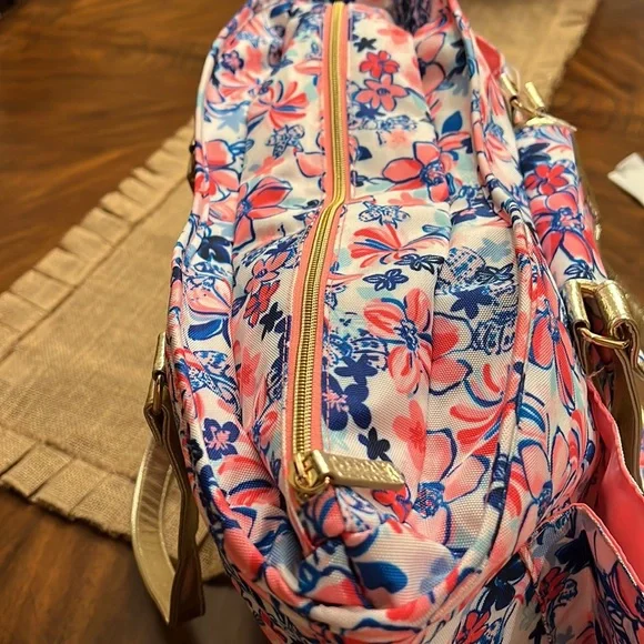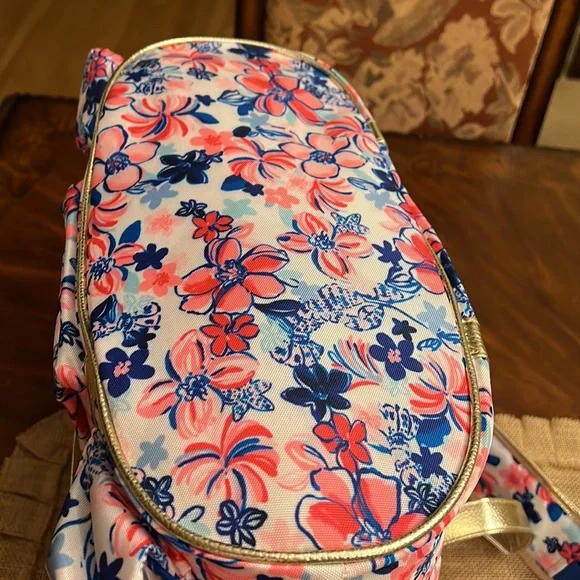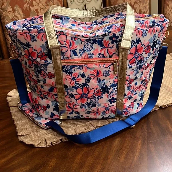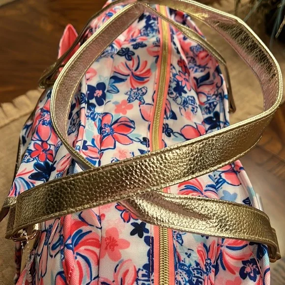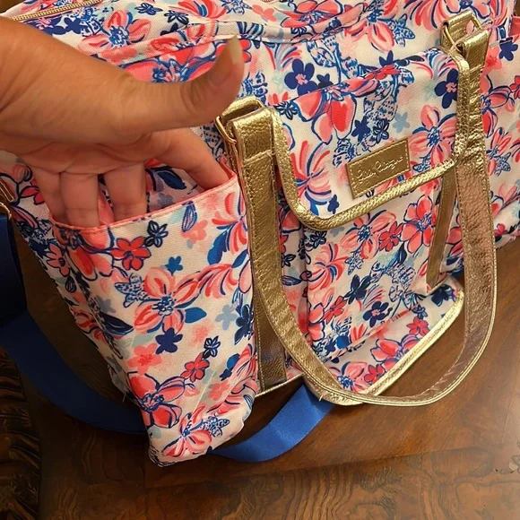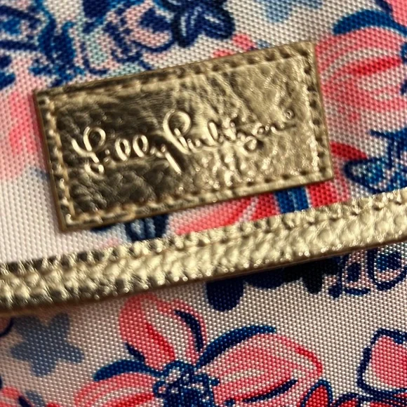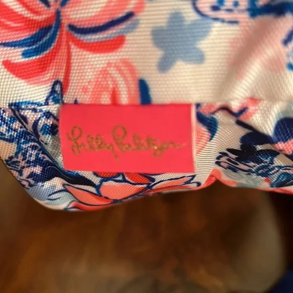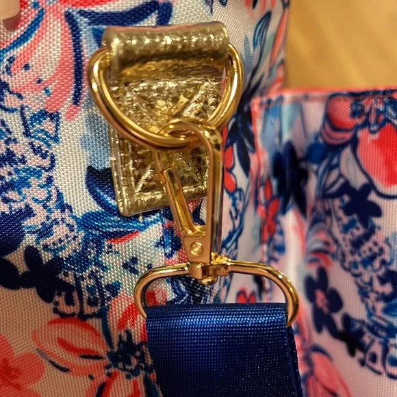 New without tags**Lilly Pulitzer Insulated Beach Tote in Party Like a LobstarLovely insulated Tote2 front pockets for water bottles, middle pocket flap closure, back pocket, zip closureinside pink satiny insulated material... Top zip closureComes with removable, adjustable shoulder strap, Two Gold hand straps, Gold trim and hardwareMeasures 19.7L X 12.0H X 7.7G InchesExcellent Condition... no imperfections