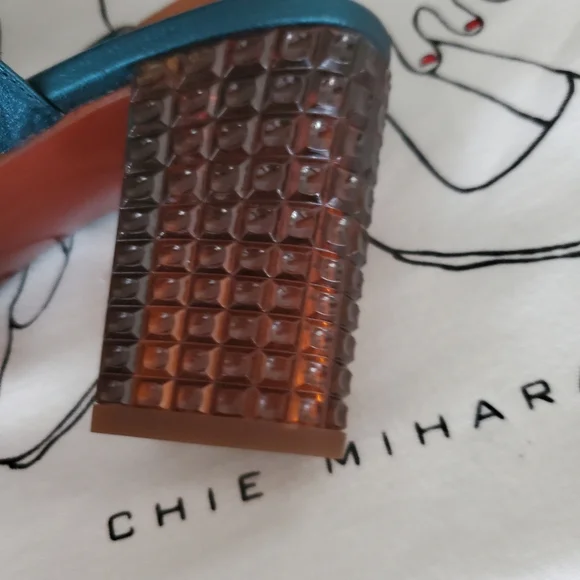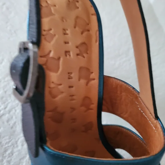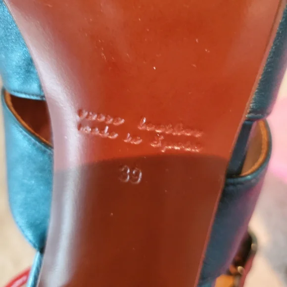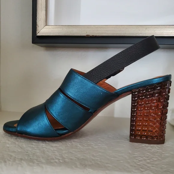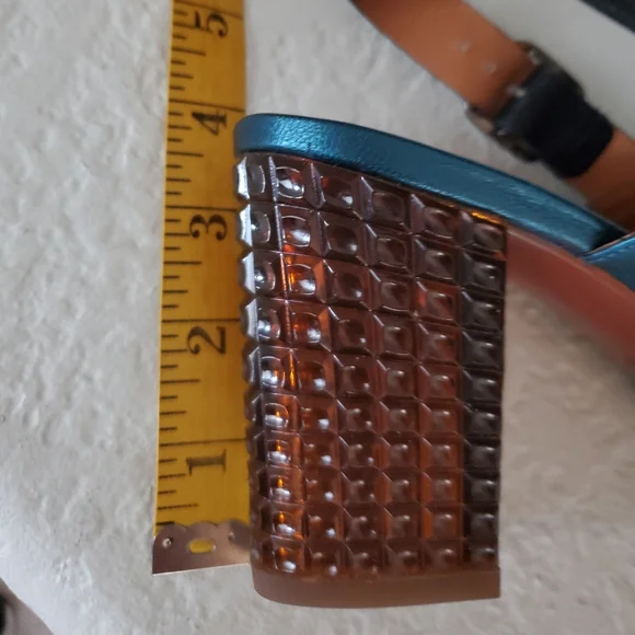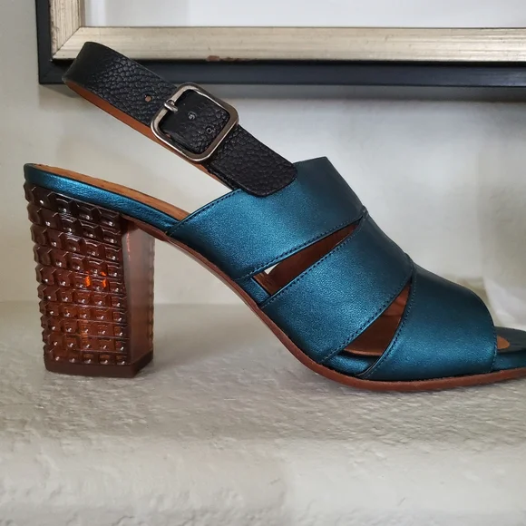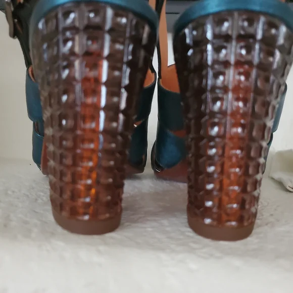 stylish sandals; metallic blue; with pebbled black strap; acrylic or plastic heels; new in box; made in Spain; smoke-free home