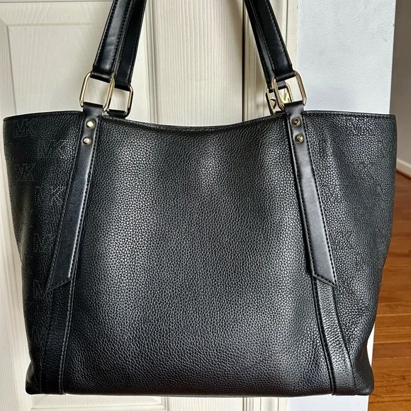 This bag has 2 different silhouettes:First as a grab bag and when interior clip is used appears as a shoulder bagApproximate Measurements: 17" across top, 14 " across bottom L x 11" H x 6" DLeather also accented with Perforated Black LeatherChain and Leather Shoulder straps with MK Logo in ChainGold tone hardwareMichael Kors name logo adorns front of bagInterior is lined in MK Signature Fabric and has 1 Large Main compartment with Magnetic Snap Closure. Interior has zipper pocket and 2 slip pockets inside.Approximate Measurements: 17" across top, 14 " across bottom L x 11" H x 6" D