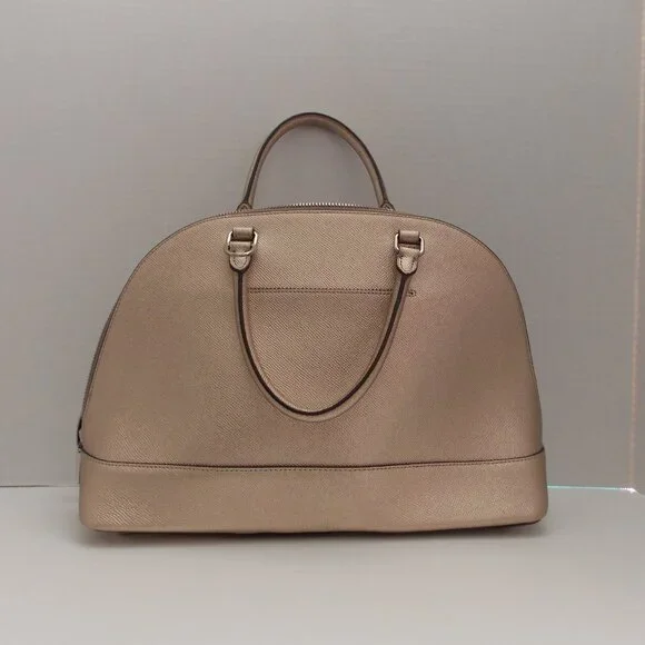 Metallic gold satchel with two handles plus long strap to use as crossbody.Stands 9 in tall and 14 in wide.Clean and in great condition.