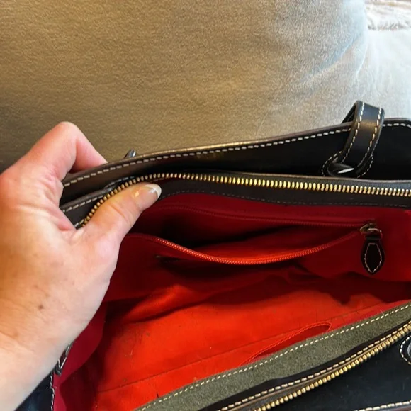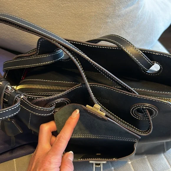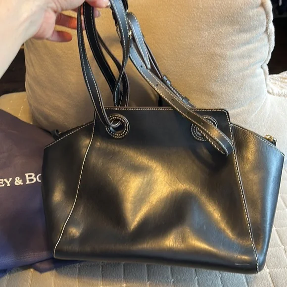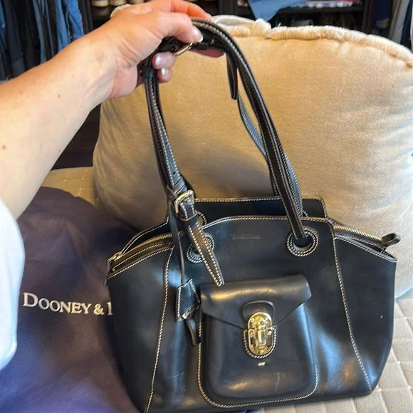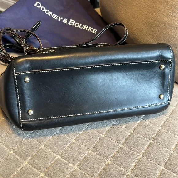 This gently used black Dooney & Bourke large satchel is a great bag that is both roomy and stylish.It has a zippered closure, with interior zipper pocket as well as an outer locked pocket. The double straps have beautiful stitching and keep the bag comfortably on your shoulder. Dimensions: H 9” x W 5” x L 12”