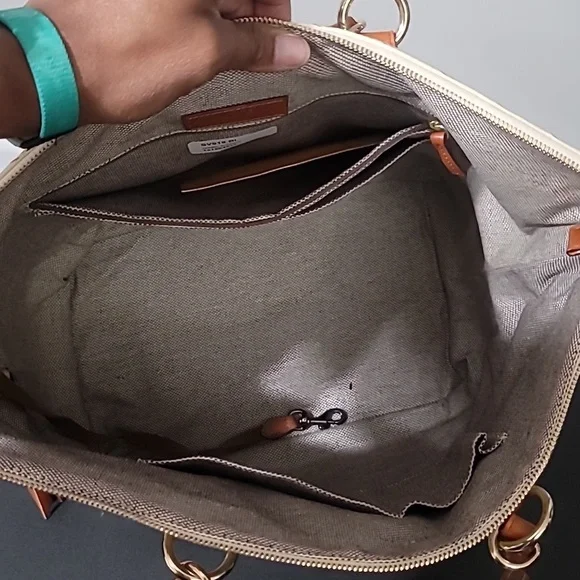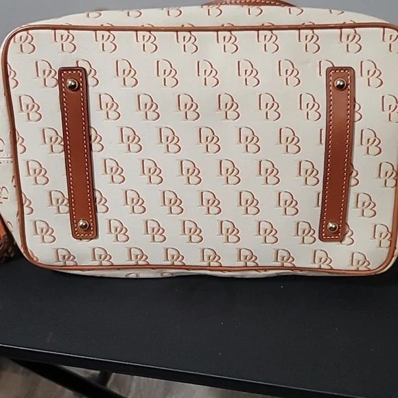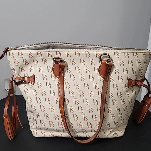 Dooney and Bourke handbag cloth material with long shoulder straps, tassels on the side, 2 inside pockets, 1 zipper pocket, and feet on the bottom. measurements are height 12 1/2 and width 19 in inches.