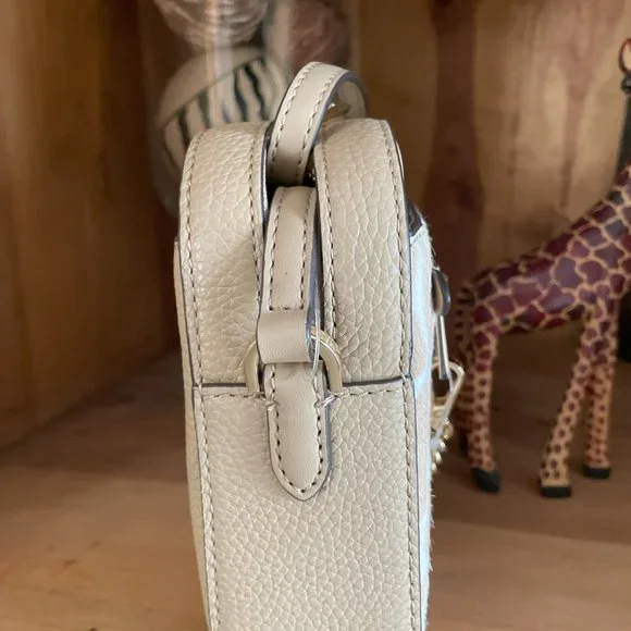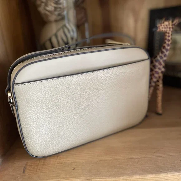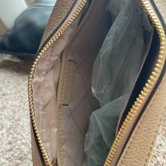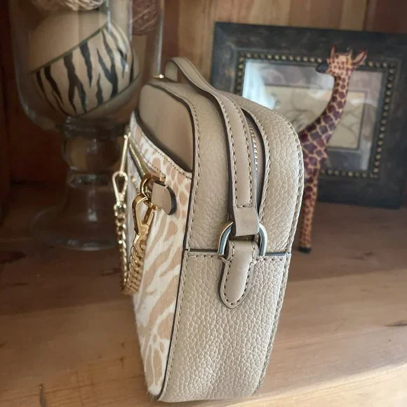 You´ve got a great sense of fashion with this durable high quality Michael Kors Crossbody BagDETAILS• CAMEL color • Crossbody bag • Leather - Calf Hair Dyed• Gold -tone hardware • 9.5”W X 6.5”H X 2”D • Exterior details: detachable crossbody strap, back slip pocket, front slip and zip pockets • Interior details: back and front slip pockets • Zip fastening PS - chain across front zip pocket is removable