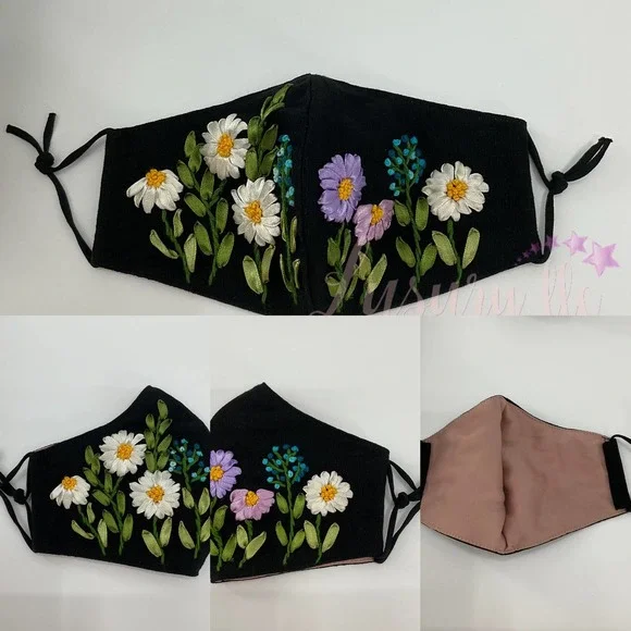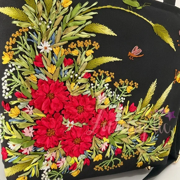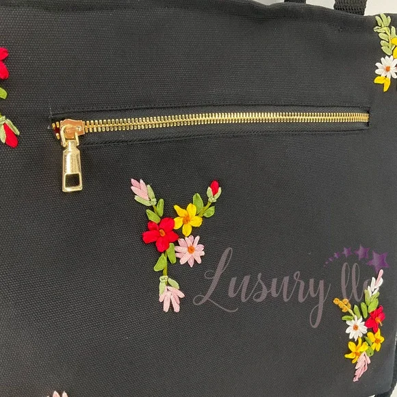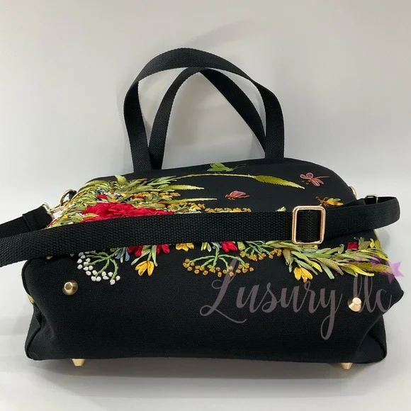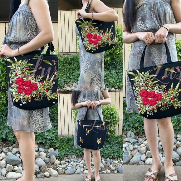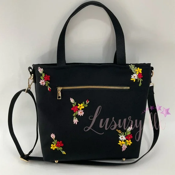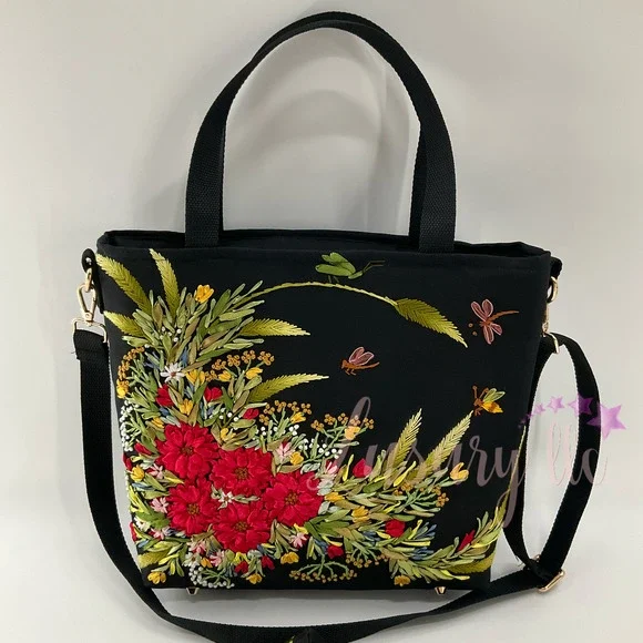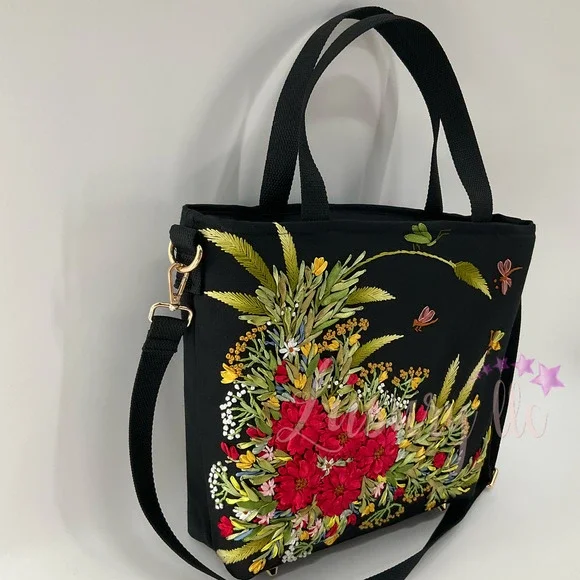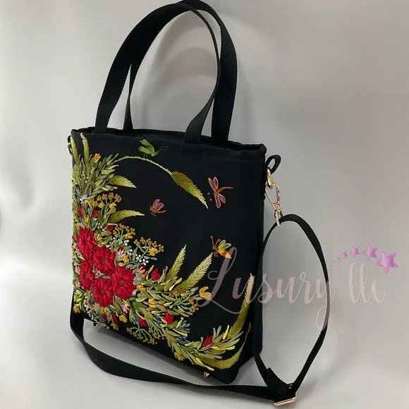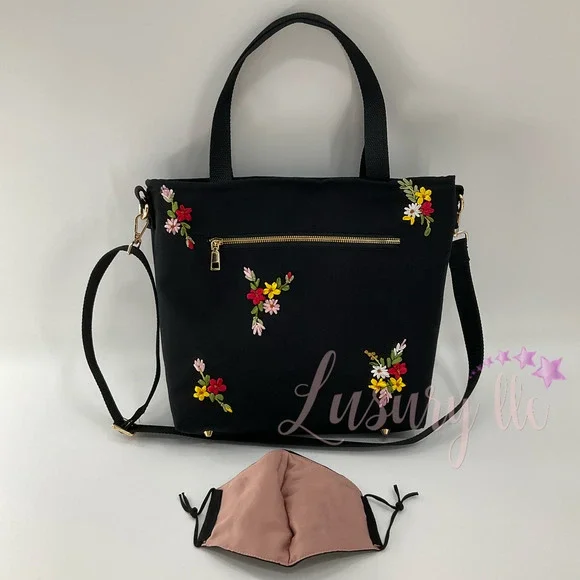 Brand newHandmadeTop notch workmanshipembroidery on the front and backSturdy & excellent qualityNonfading materials** Convertible crossbody bag and tote all in one Material:Aramid out-shell, polyester liningColor: black; burgundy red lining; green, red on detailsZipper ClosureRust resistant metal hardwear with 360 degree rotation4 standing feet on baseExterior Details: 1 Back Zipper PocketInterior Details: 1 Zipper Pocket, 1 Slide Pocket; 1 main compartmentApproximate measurements: 12"L x 3.6"W x 11"H1 Adjustable & Detachable Straps, ~ 0.9" width, ~ 43.5" max length, ~ 23.5" min length2 Handles, ~ 0.9" width, ~ 18" lengthAbility to contain 14-inch laptop, planner & more.** Matching face Mask:Replaceable Ear Loops / strapsApproximated Dimensions: 9" * 5.3"Color:black; beige lining; green, white, purple on detailsTheme: floralCan be reused many timesHas no nose wire_ 3 layers _Out layer: LinenMiddle layer: CottonLining: 100% pure silkHand washIf wanted, please iron the silk layer of the mask in low heat & avoid embroidery details.An exclusive stupendous gift for yourself and your beloved women.New accessory to match your outfits & any occasions.Loads of compliments on the way! :)Please note: It is normal for all of our products to have unique variations and character markings that are inherent to handmade goods. Color may also vary slightly.