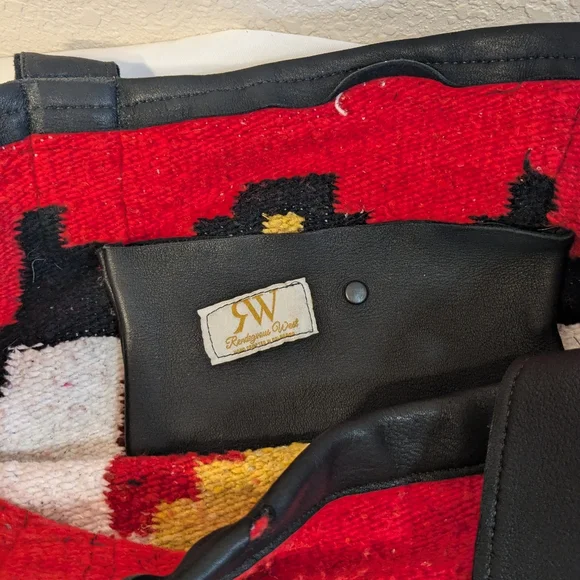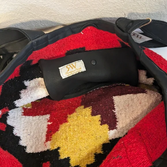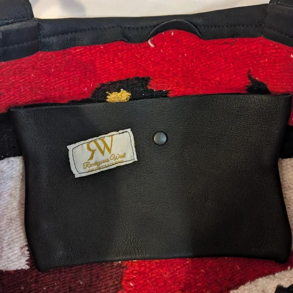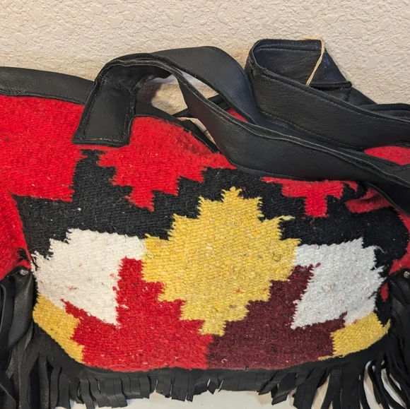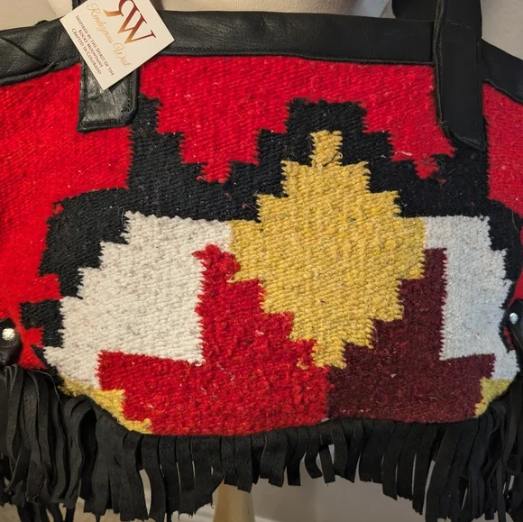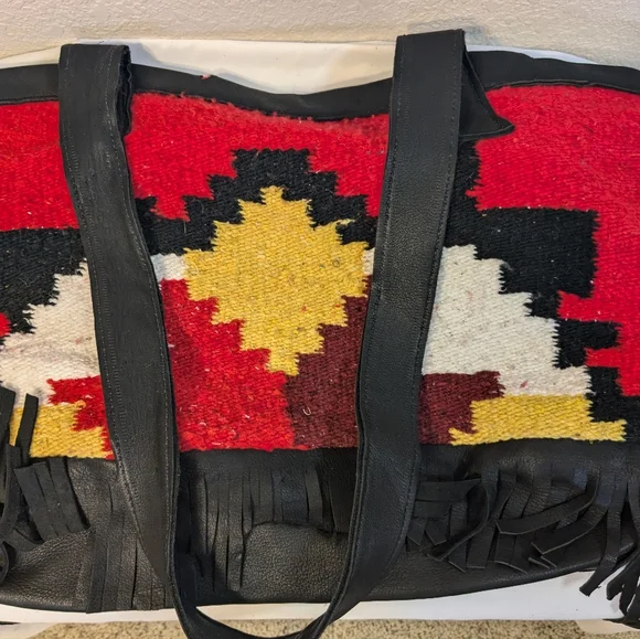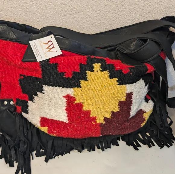 This tote is made from a blanket type material and deer hide hide. It has one big main opening with one inside pocket with a snap closure. Lots of room!!Tote measures 19" across, 13" in height, and 15" length from shoulder to purse (not including fringe).Tote is NWT, free of stains, and imperfections. Smoke free.