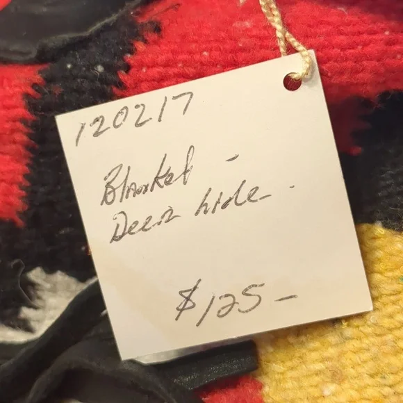 This tote is made from a blanket type material and deer hide hide. It has one big main opening with one inside pocket with a snap closure. Lots of room!!Tote measures 19" across,...