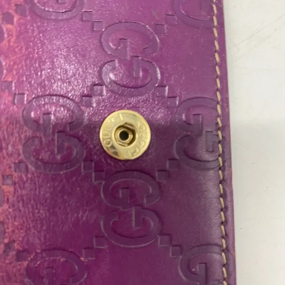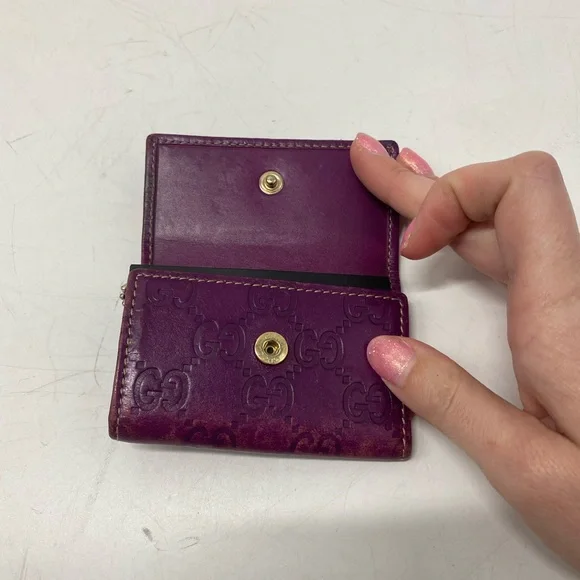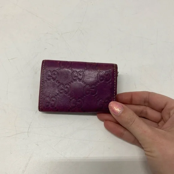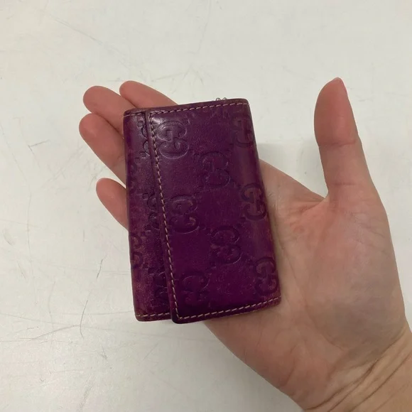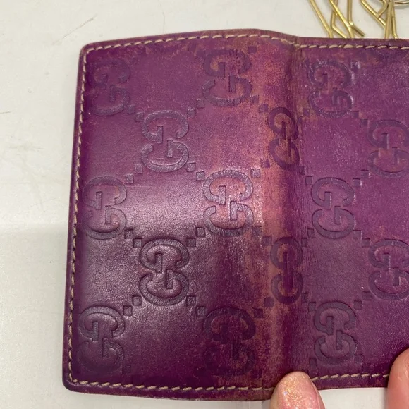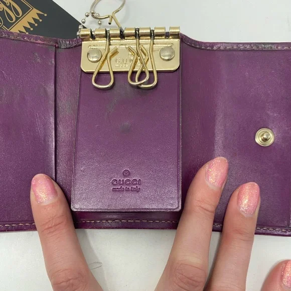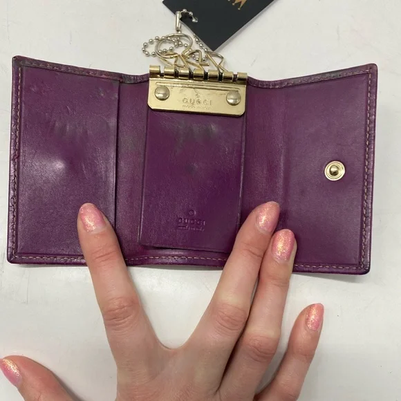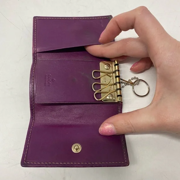 key ring holder Purple leather with gold hardware Approx 4”x .5” Approx 7” fully openedFunctional snap closure Features 4 ring hooks 1 card sized pocket Item shows signs of wear from normal use- worn corners, aged leather, discoloration of leather Etc.please refer to photos for further details JPO8508 C12In store and our website for $90