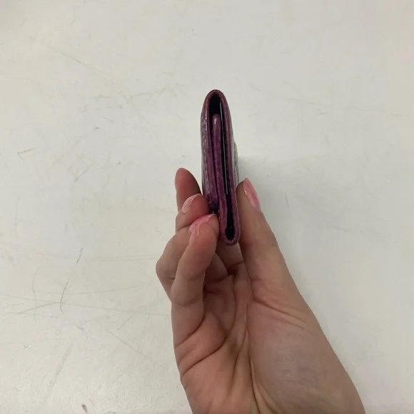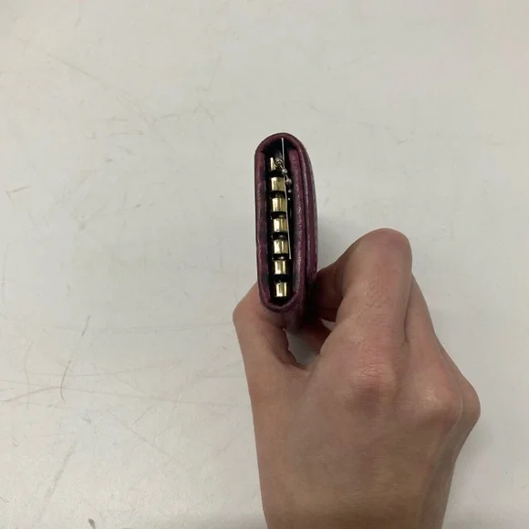 key ring holder Purple leather with gold hardware Approx 4”x .5” Approx 7” fully openedFunctional snap closure Features 4 ring hooks 1 card sized pocket Item shows signs of...