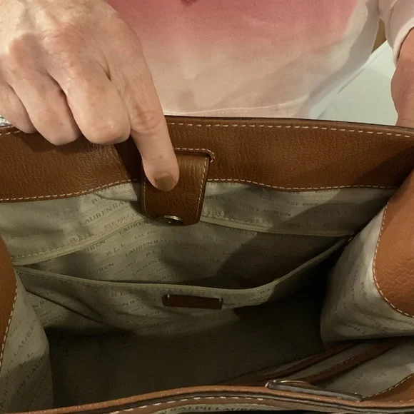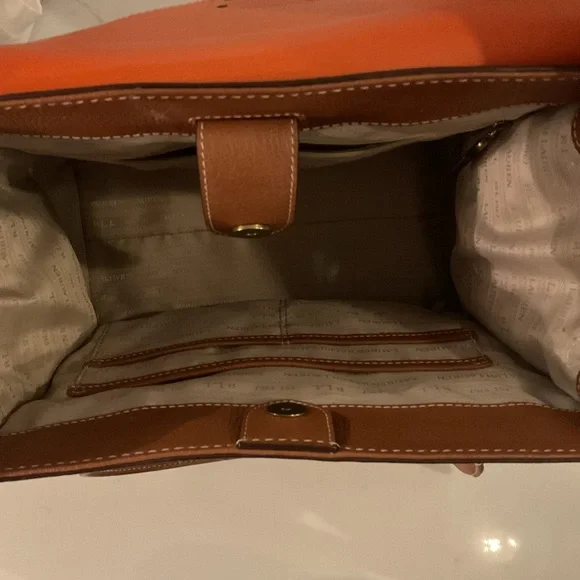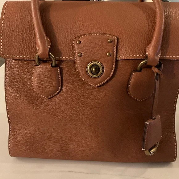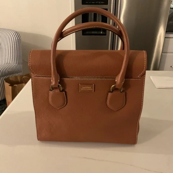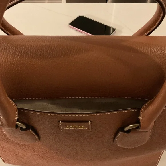 Field Brown Exterior ColorOrange Interior FlapMeasures 12 x 6 x 12 inches Bronze hard wear Timeless design Genuine pebbled leather 2 exterior pockets 4 interior pockets (one zipper)Interior snap closure and exterior locking mechanism featuring the Ralph Lauren logoLike new condition