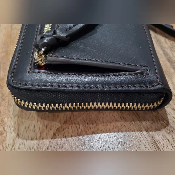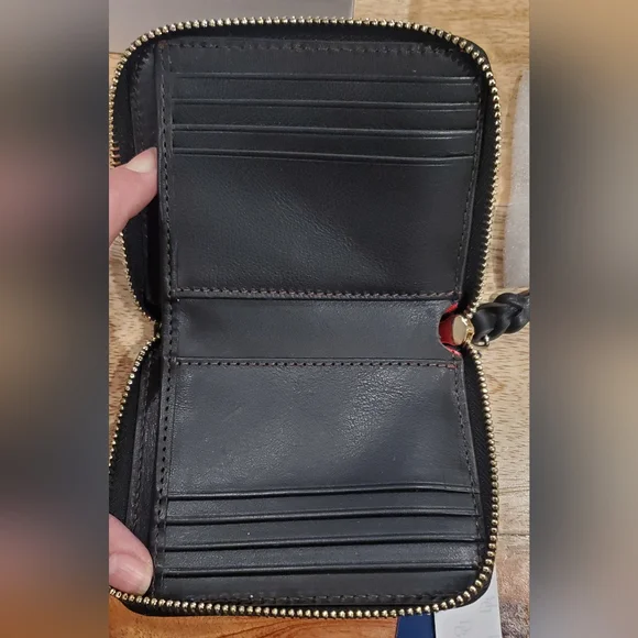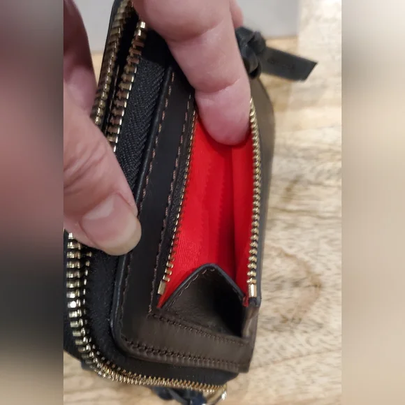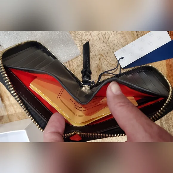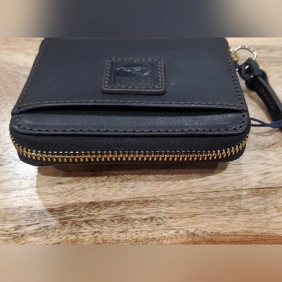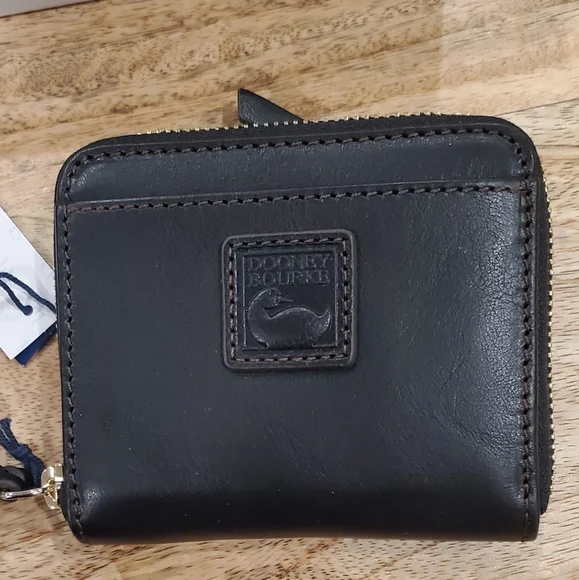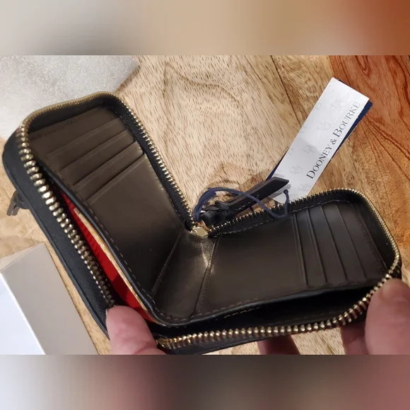 New box, has tags and registration card.Dooney & Bourke small zip around wallet.Measures 4.75 x 4 x 1Florentine Leather exterior and interior.Outside has a front slot, back has a zip change compartment. Inside has a bill pocket, 8 card slots and 2 pockets underneath slots, all contained with a zip around closure.Color is BLACK/BLACK