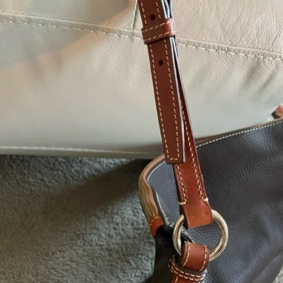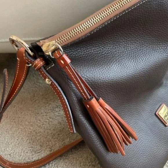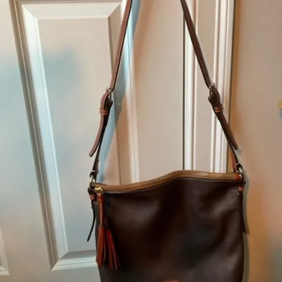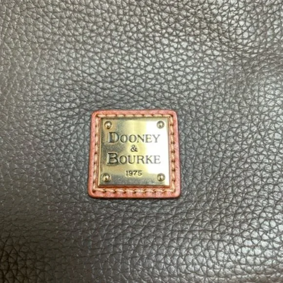 Dooney & Bourke brand new dark brown leather shoulder bag.Gold zipper close; red interior fabric. Adjustable shoulder strap. Brand new. Tags not attached. 12" Width, 13" Height.