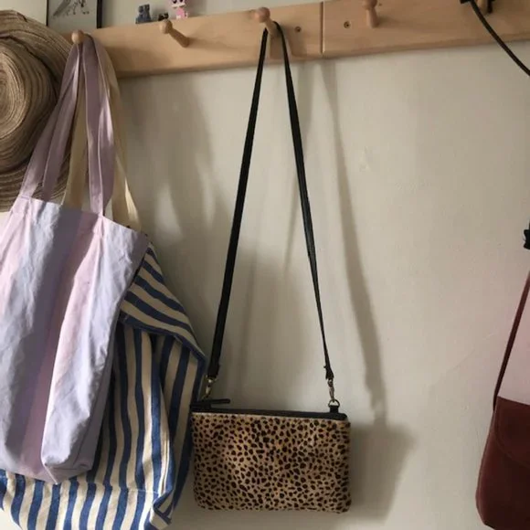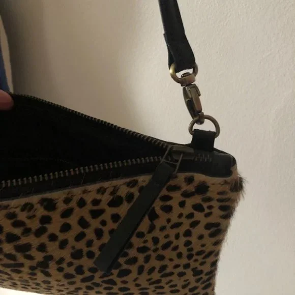 Primecut cowhide purse in tiny spotted print. Material is cowhide on full exterior and black linen lining inside. Inner zipper pocket and removable leather strap. Measures 9" x 5" and ~.5" depth. Strap is 23" drop. Can be carried crossbody easily or over the shoulder.They no longer sell this style/size with a strap. In perfect condition, only carried lightly.
