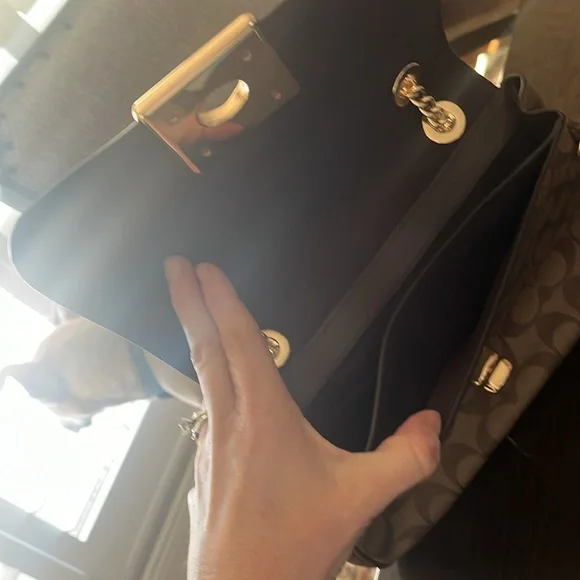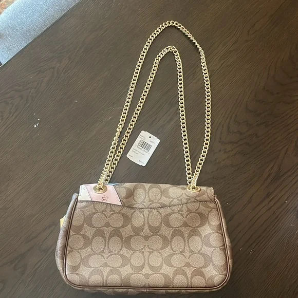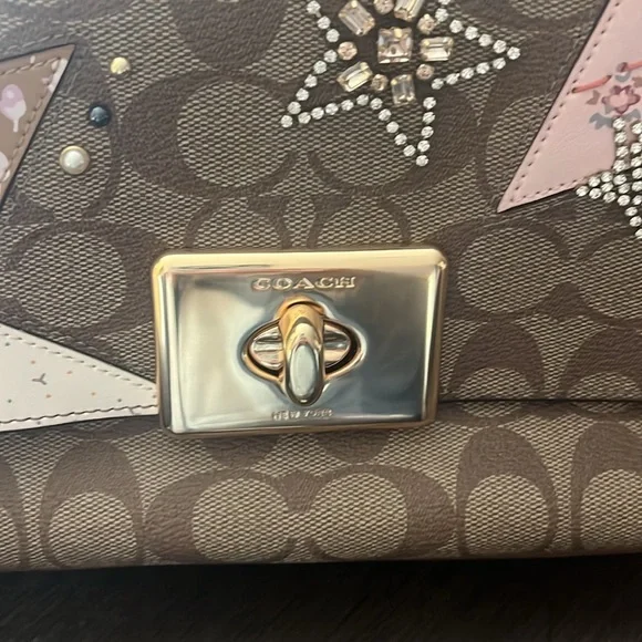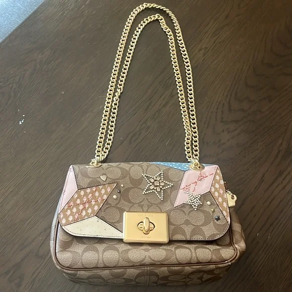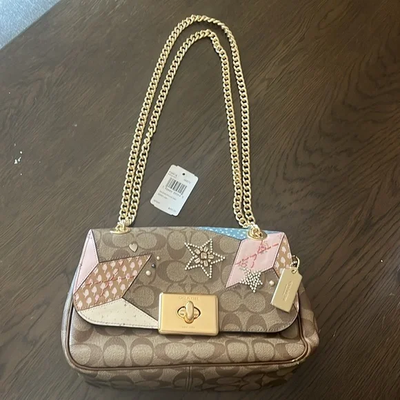Coach signature star patchwork designed purseGold chain strap can be doubled for shortened length or elongated. New, never used, plastic film still on tag to protect from scratches