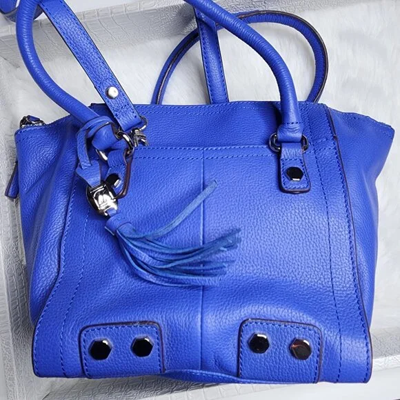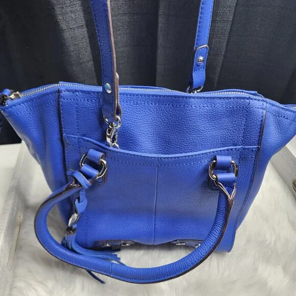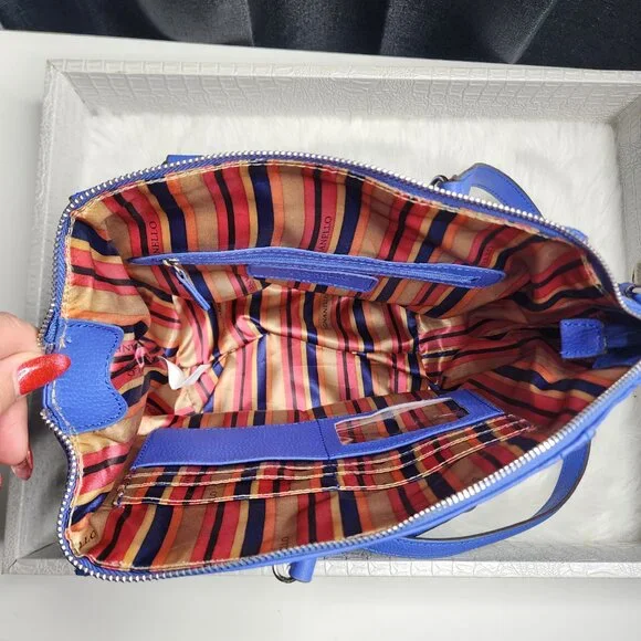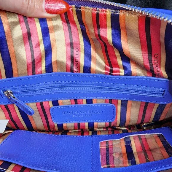 Tignanello lapis Blue pebbled leather satchel with silver hardware*Multi CC Slot Organizer on One Interior Side*Pretty Multi Color Striped Interior lining*Zipper Pocket*Exterior has an Open Pocket on Each Side, With A Removable Shoulder Strap*Measures: 12” x 9” x 5” *New without tags, great condition.