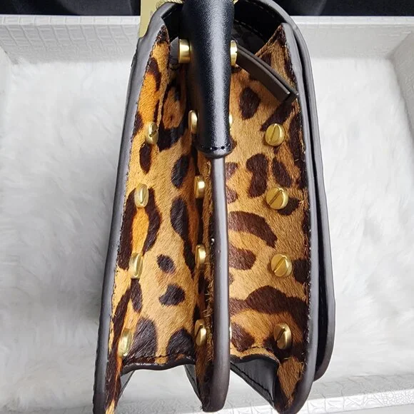 Vintage Aimee Kestenberg black leather crossbody with faux leopard print hide and gold grommet accents on sides, This gorgeous purse comes with a magnetic clasp flap closure. Open back pocket. Inside: 3 compartments, backside has zippered pocket, middle is zipper closure, front has open pocket. Dimensions: 9"W x 6"H x 3"D Brand new never used, tags and protective wrapping still intact.