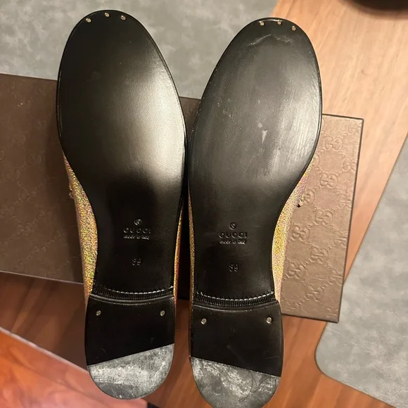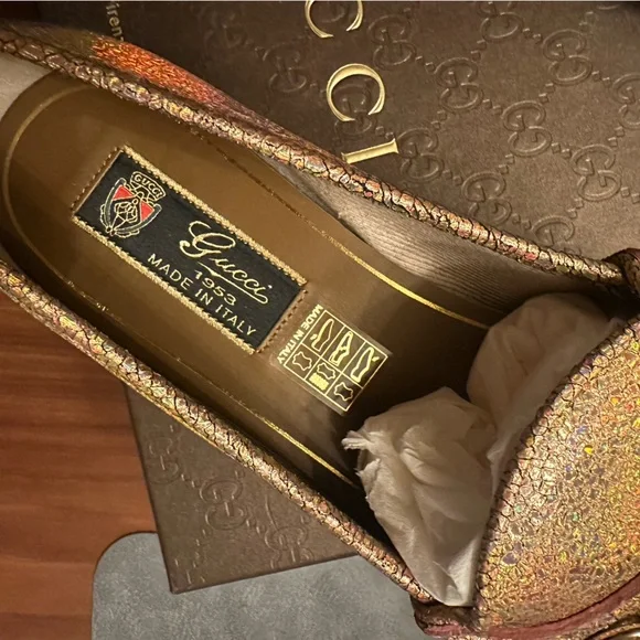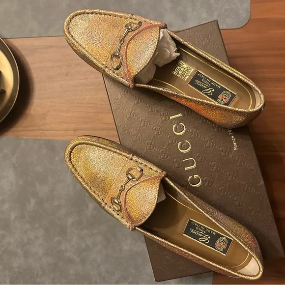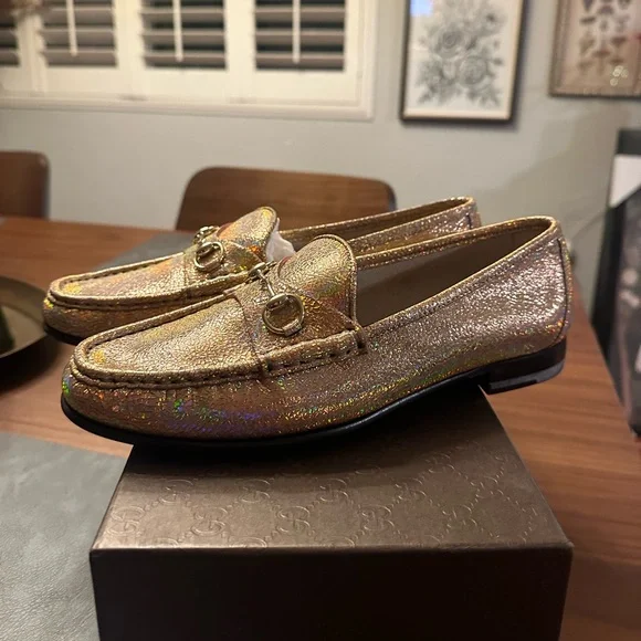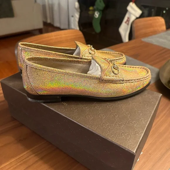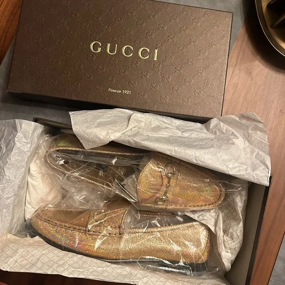 Step out in style with these luxurious gold loafers. Perfect for adding a touch of elegance to any outfit. These ´s are not leather, they are canvas . Great for spring and summer.Fit like a US womans size 9. Authenticated by .