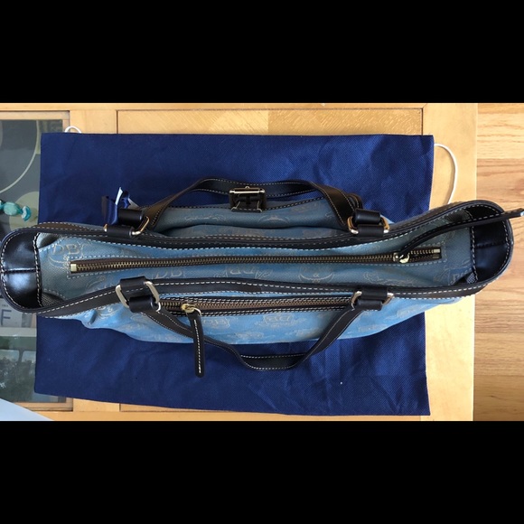 Authentic Dooney & Bourke Handbag, Black/Brown/Blue Color, Includes Dustbag & Coin Purse, Clean inside and out, Includes registered card w/ number censored in pictureDimensions: (Bag) Ht: 10”, W: 14”, D: 5”, Zipper 12”; (Coin) 3”x4”