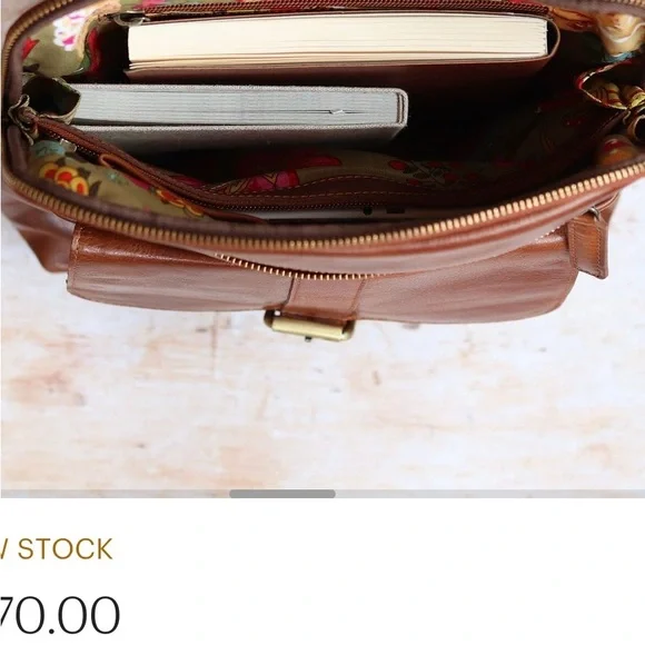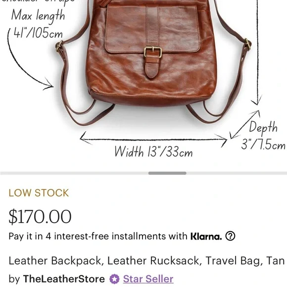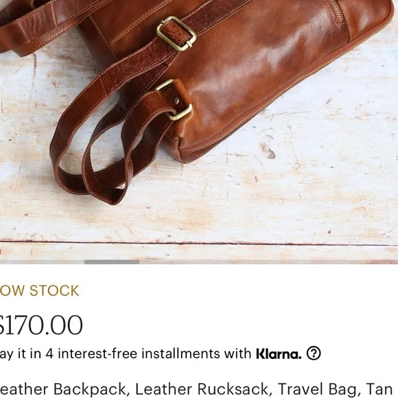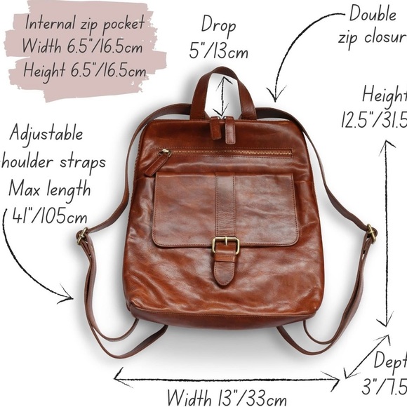 Genuine leather backpack , rich caramel color, zip pockets with fabric lining. Adjustable straps