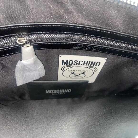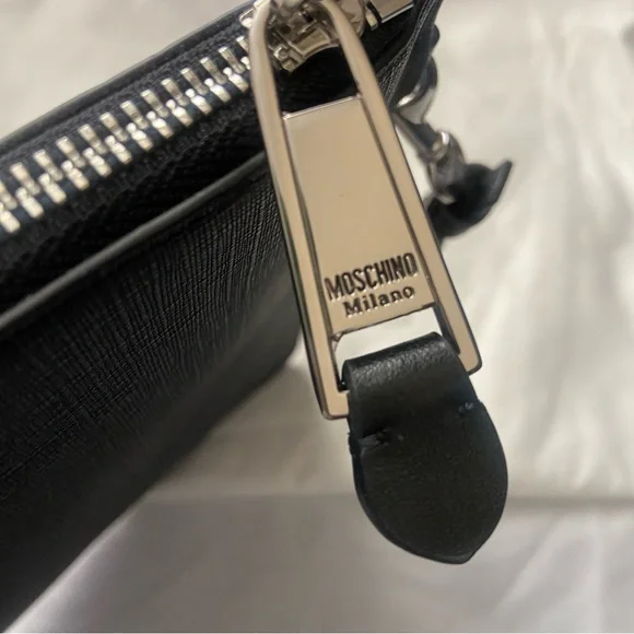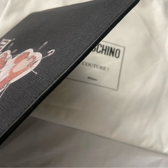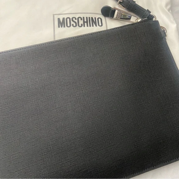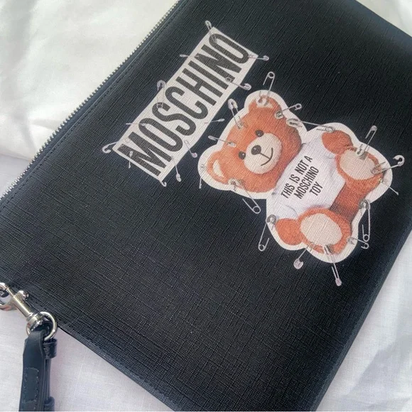 CLEARANCE SALE. PRICE IS FIRM.New. Has dust bag and care cards Moschino Bear and logo printed clutch bagBlack leather and silver hardware Large size about 11.5” W and 8.5” Ha removable wristlet