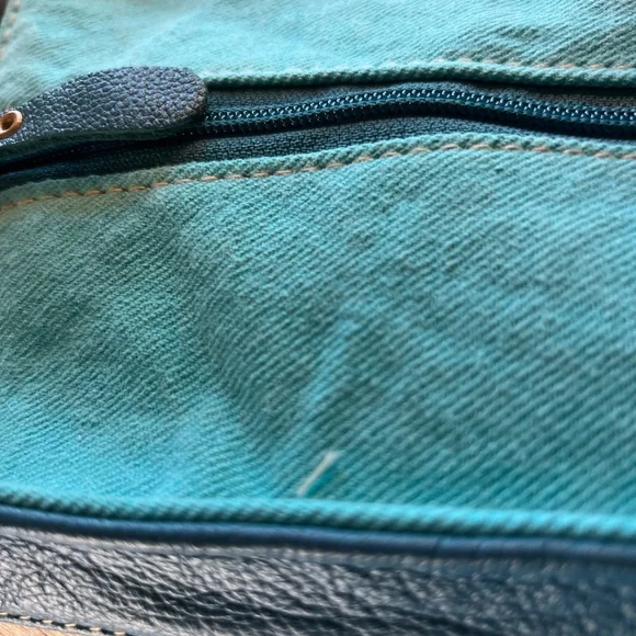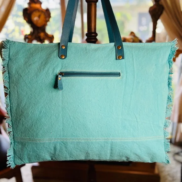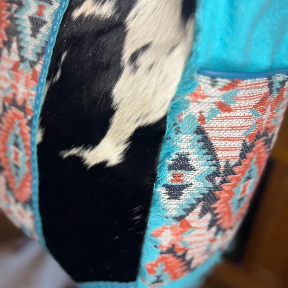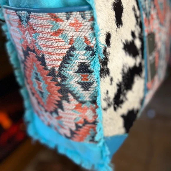 A gorgeous entry in our "Tonga Ridge Trail" collection, this bag offers everything! A wonderfully balanced style presents beautiful hair-on hide, in a light-dark mottled pattern, which frames a gorgeous inset of tribal-inspired woven upcycled rug. The front has special accents of beautiful blue leather and frayed edge treatments. The roomy interior has several pockets for great organization. The reverse features matching woven canvas and a zippered pocket. Carrying handles in matching leather complete this great bag. Very alluring!View lessMore InformationMaterials Hairon, Leather, Canvas & RugItem Width 20Item Depth 8Item Height 16Handle 12Item 2128-391