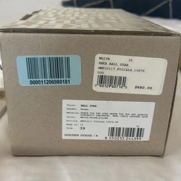 Golden goose Ball Star women’s sneaker sz 39Gently worn comes with original box and paperwork also never been used shearling liner for footbedWhite/Taupe/ SilverMade in ItalySZ...