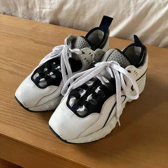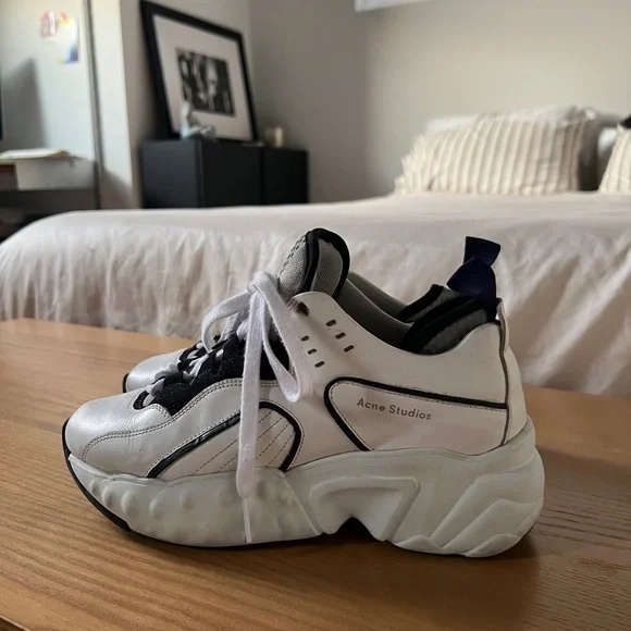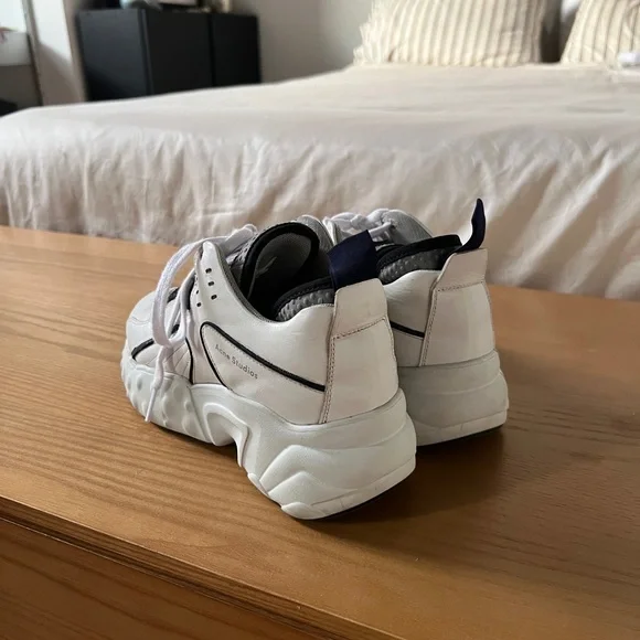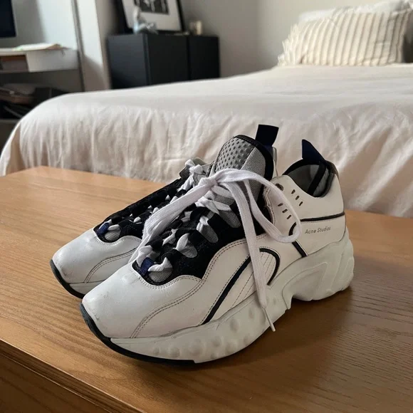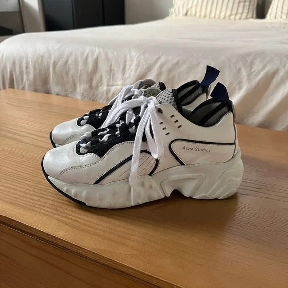 These Acne sneakers are a classsssic. A futuristic chunky design with a predominantly white upper accented by blue details. The thick, cushioned midsole ensures comfort. Perfect...