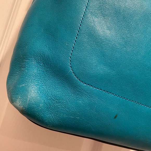 Beautiful Turquoise leather Coach bag, lined with various compartments. Minor scuff marks shown in pictures. Retailed for $395; great deal!!Comes with dust bag