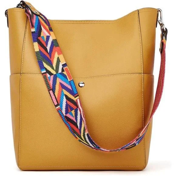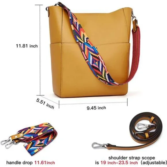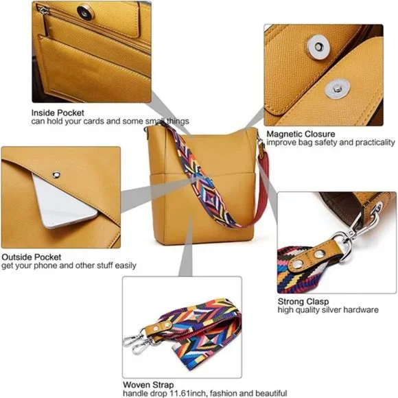 High Quality: The handbag is made of vegan leather by professional craftsmen. Pure color design, silver hardware, these make this hobo bag more stylish. Metal magnetic buckle closure for extra security.Dimensions: (L)9.45" x (W)5.51" x (H)11.81". Handle drop is 11.61 inch, long enough on your shoulder. Also come with a long adjustable shoulder strap (49.5" in length) for more carrying options: Single Shoulder/ Cross-body.Structure: Internal structure is one main compartment including 1 main pocket,1 inner zipper pocket , 2 slip pockets, one of which is a cell phone pocket and one is a ID card slot. External structure including 2 side slip pockets and 2 metal magnetic buckle pocket that one in the front and the other in the back.Design: Hobo style, bucket bag. Two shoulder straps, one of them is leather, one is woven, you can according to your liking more change strap style! The adjustable long strap can be used as a single shoulder strap or crossbody.