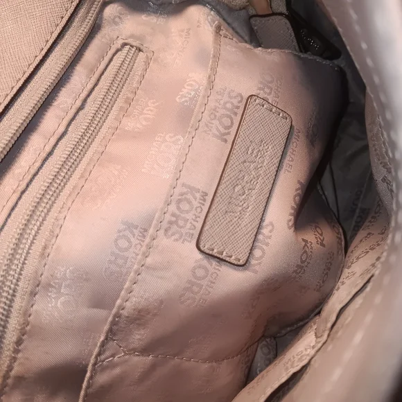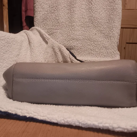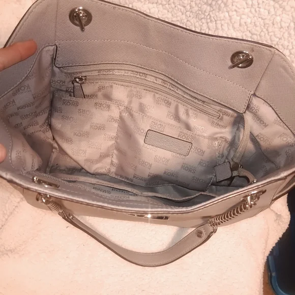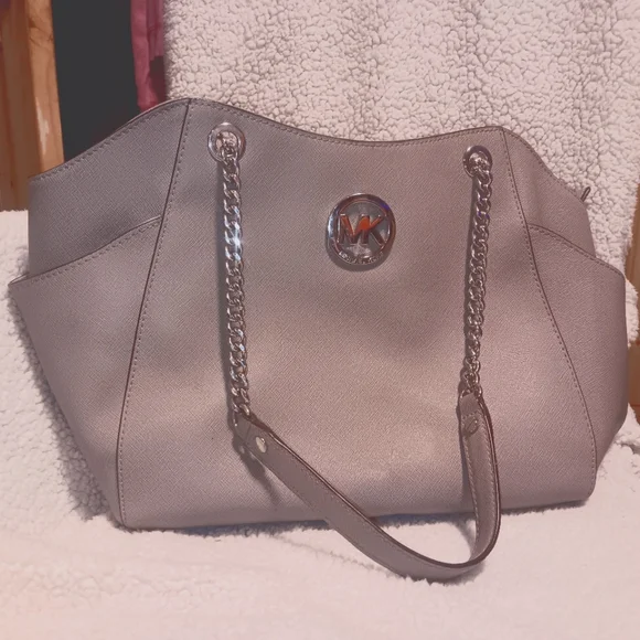 Michael Kors elegant gray shoulder bag with double leather handles & chains giving about 10" shoulder drop. Saffiano leather. No marks, No wear, Like New! Does not come with MK dust bag or MK leather tag.Zipper closure, Interior: 1 zippered pocket & 4 slip pockets, two outer side compartments.Approximate Measurements: 11" -14" (L) x 10.5" (H) x 4.5" (D)