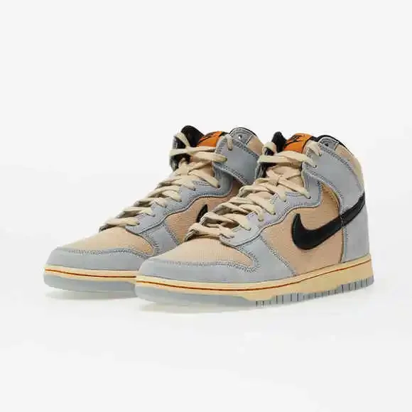 The Nike Dunk High SE hemp Hoops combines khaki-colored hemp canvas with suede overlays in Light Pumice. Contrasting black accents settle on the textile collar lining and leather Swoosh. Cushioning is limited to an interior foam wedge, housed in a rubber cupsole built with stitched sidewall construction and a grippy rubber outsole, featuring a traction pattern originally designed to grip the hardwood.New in Box SKU A1204 /