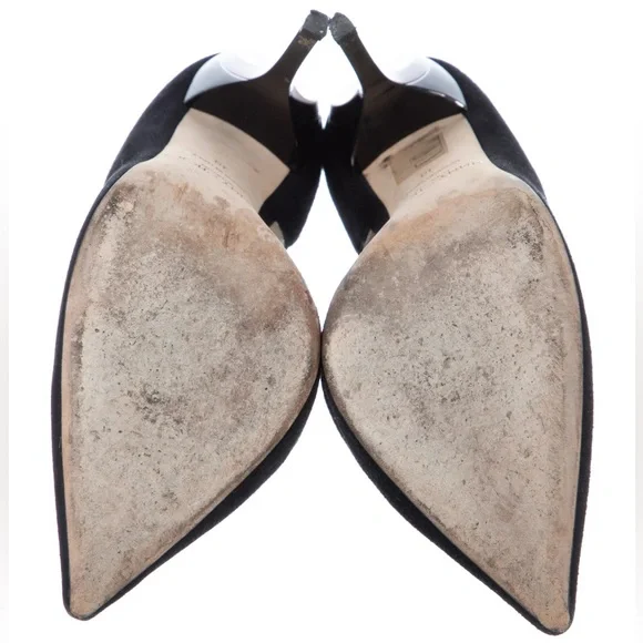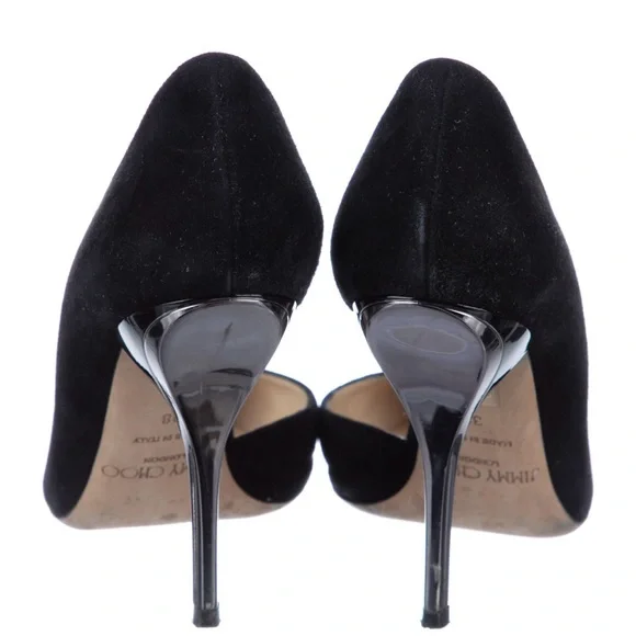 Jimmy Choo Black Suede D´OrsayHeels: 4"Shoe Size: 8Color: BlackForeign Size: IT 38Pointed-ToesStiletto HeelsFit: This style typically runs a half size small.