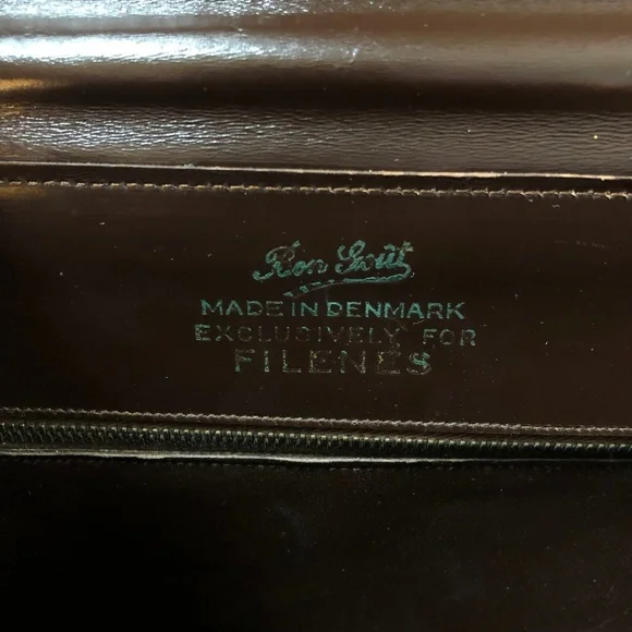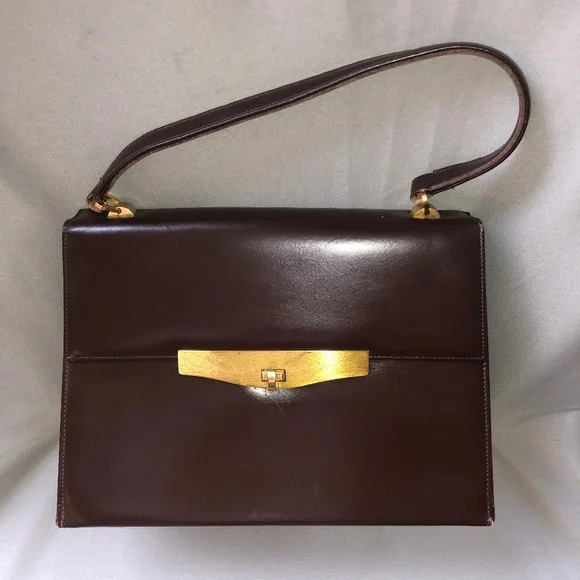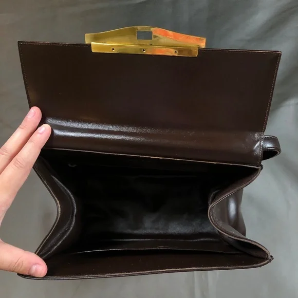 Vintage 1960s Bon Gout dark brown leather purse with singular strap and gold hardware. Made in Denmark.10 inch length4.5 inch width7.5 inch height