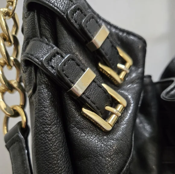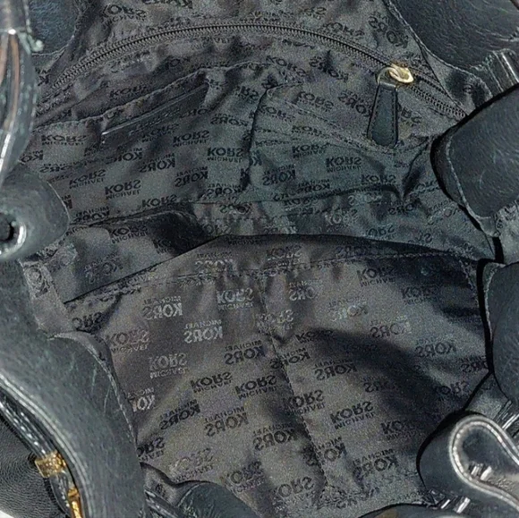 Michael Kors black Leather BagGorgeous Soft Black Leather BagApprox Meas: 12" W x11" H2 Straps: shorter one has approx 8.5" strap dropLonger one has approx 16" strap drop and isremovableGold Tone HardwareMagnetic Snap Top ClosureInterior: 1 zippered wall pocket, 4 slip in wall pocketsGreat condition with a few small scuffs