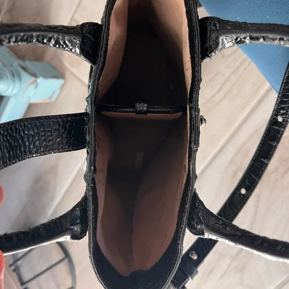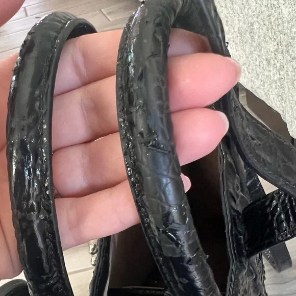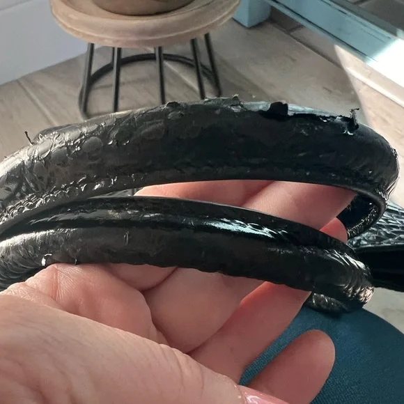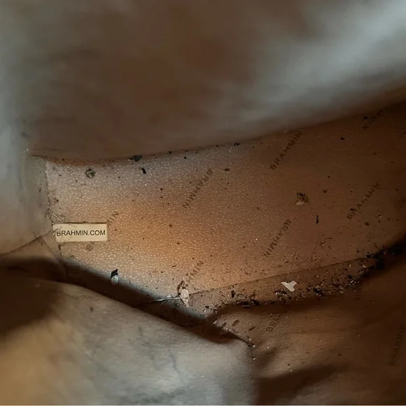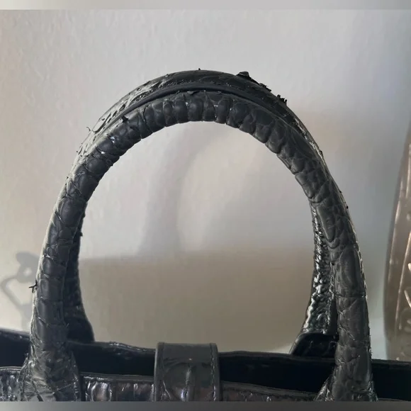 Brahmin Sonoma Tote Satchel Crossbody Purse.Featured in Black Melbourne, this Brahmin bag has the signature croc-embossed leather in classic black.Genuine leather. Please see wearing on the handle strap with some of the shiny embossing wearing off. Purse could be restored by a professional, of you can use it as is.Price reflects the wearing.Details:Removable adjustable crossbody strapBack slide in pocketCenter divider included (see photos)Footed bottom (all feet intact)Adjustable rivet closureDIMENSIONS9.0″ W 12.0″ H 4.5″ DWEIGHT2.1 lbs / 0.95 kg