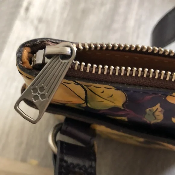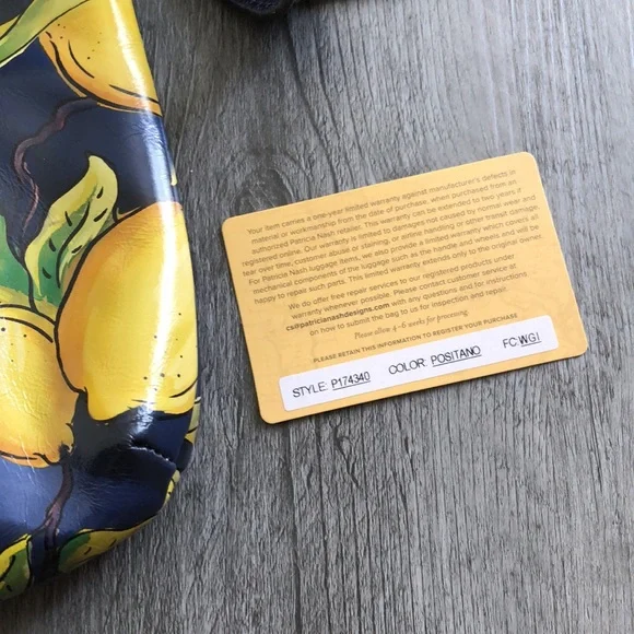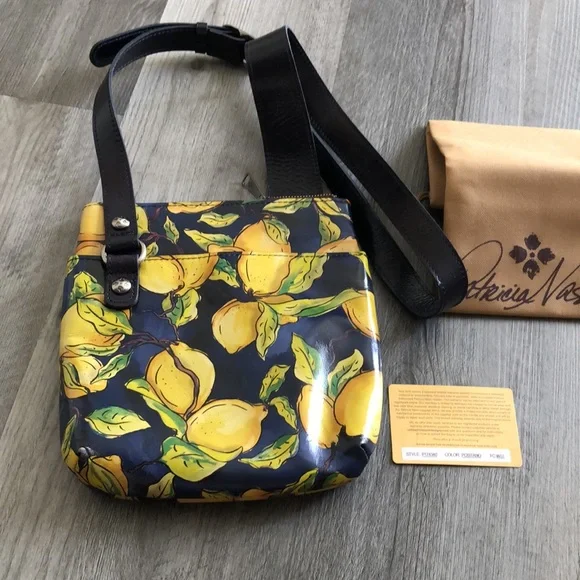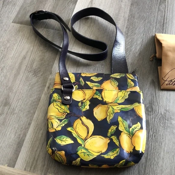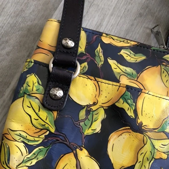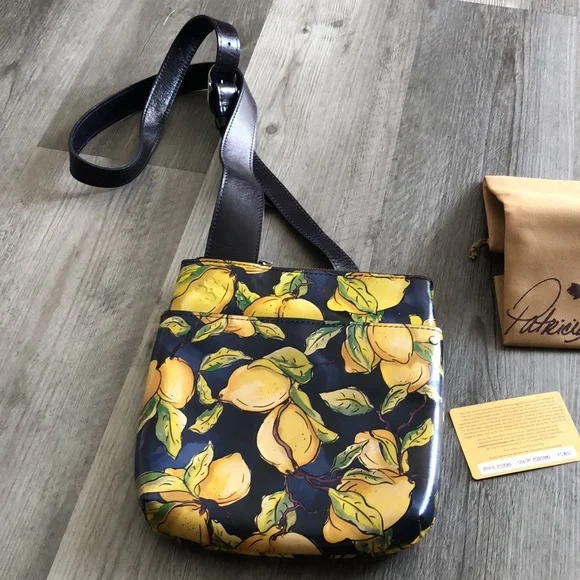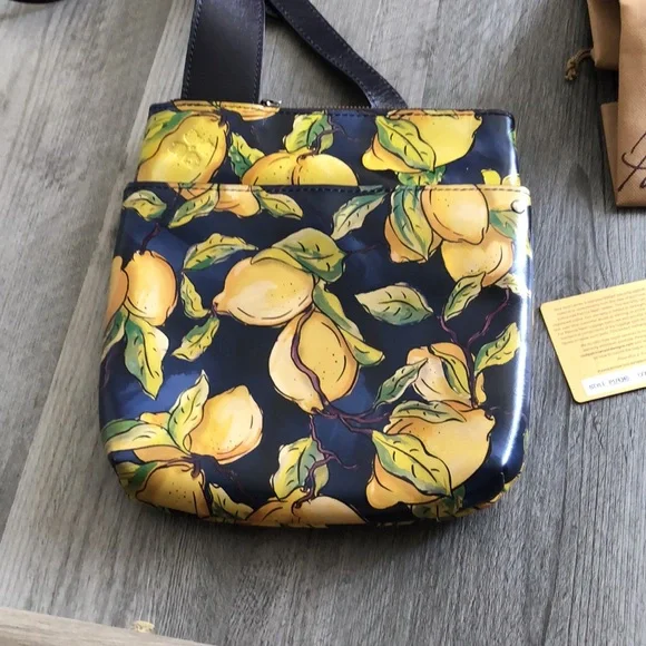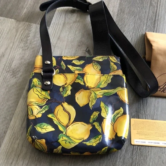 100% leather sling crossbody in the Positano Limon print on front & back of bag. Navy black sloped adjustable crossbody strap with strap drop of 26”. Strap with silver tone buckle. Front and back of bag with 1 magnetic slip pocket. Back of bag with deep embossed floret logo. Silver tone brushed nickel hardware. Silver tone dome button accents on front strap with floret logo. Inside bag brown faux suede lining with 1 zip and 2 elastic pockets. Top zip closure with zipper pull stamped with a floret. Dimensions 8.5” inches wide and 10” inches high and 1.5” inches deep. Includes dust bag & registration card. MPN P174340. Made in China.