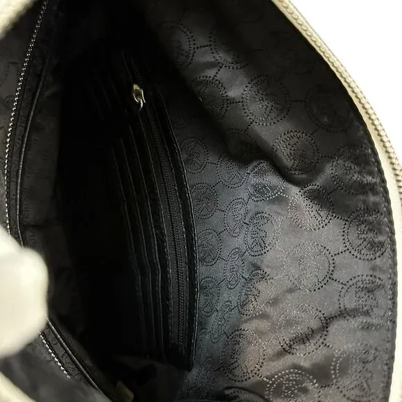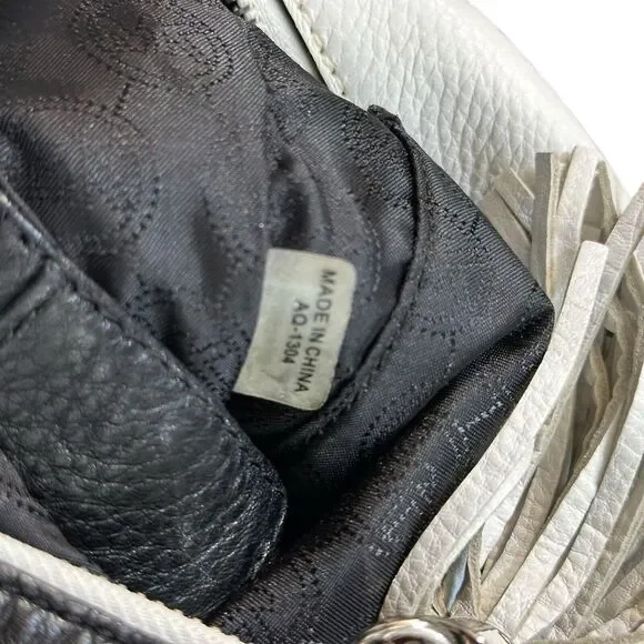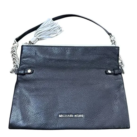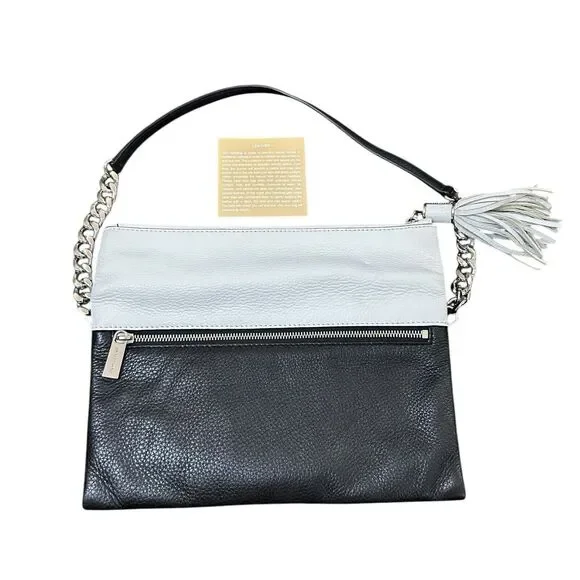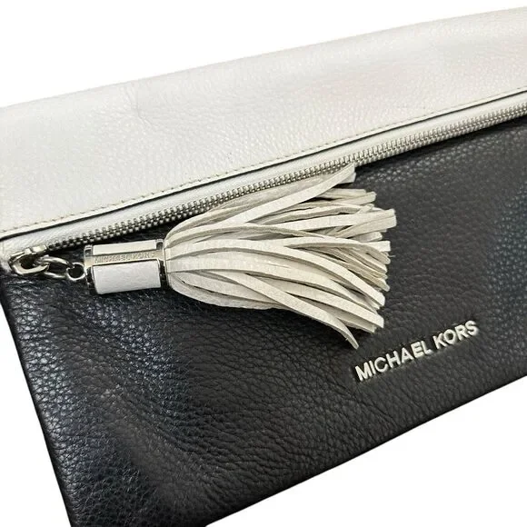 Michael Kors Tonne Black White Silver Pebble Leather Foldover Clutch Bag Tassel