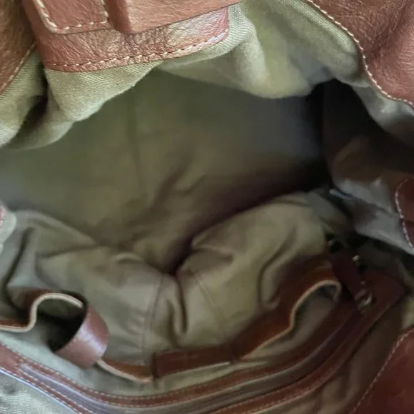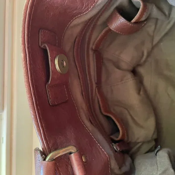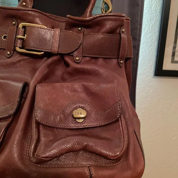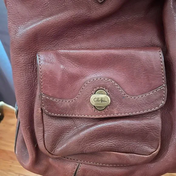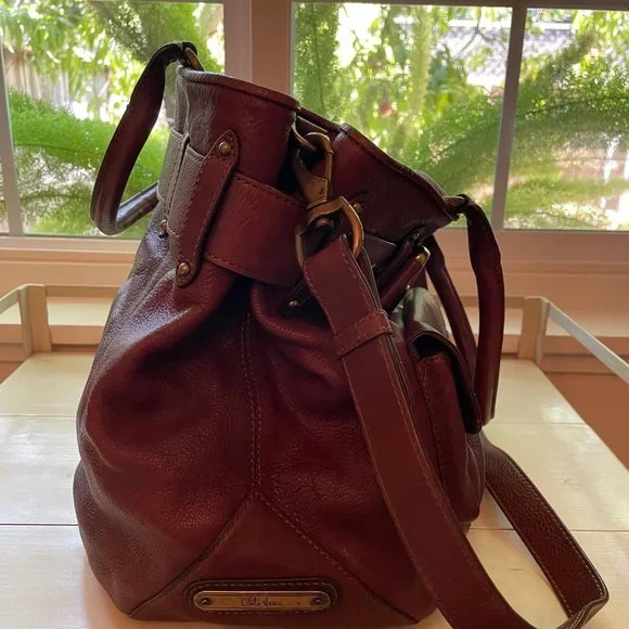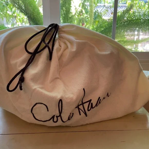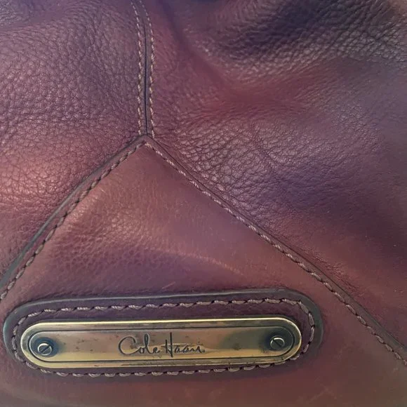 COLE HAAN Brown Pebbled Leather Satchel Shoulder BagStraps to Carry by HandBrass Buckle & Hardware DetailsInside Snap Closure 2 Front Pickets with Toggle ClosureInside 1 large zip pocket and 2 smaller pockets (1 with a closure) the larger of the 2 smaller pockets fits a cell phoneComes with the original Cole Haan cloth bagMeasurements:Bottom of Bag = 16 inches in length & 8 inches wideHeight of bag 11 1/2 inchesShoulder Strap measures 33 inches and can be made a bit shorter or longer Pre-Owned and in fairly good shape with the exception of a few worn spots on the back (see photos)