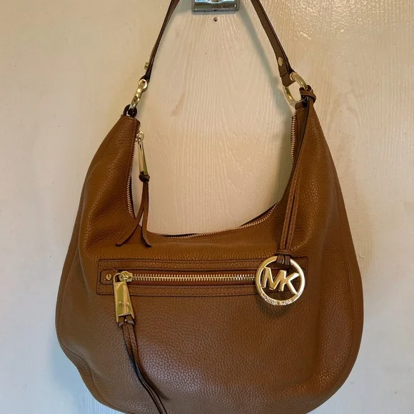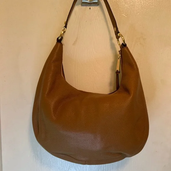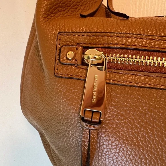 Beautiful pebbled leather handbag, NWOT. Color is Acorn. One large zippered outside pocket with one inside zippered pocket & 4 slip pockets.Logo interior.Measurements: H-9.5 W-14 D-2” Handle drop is 7.5”Bag has been kept in a temperature controlled closet.