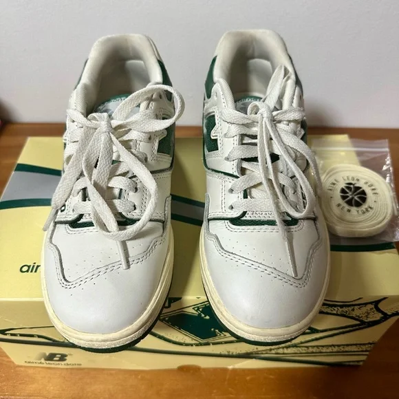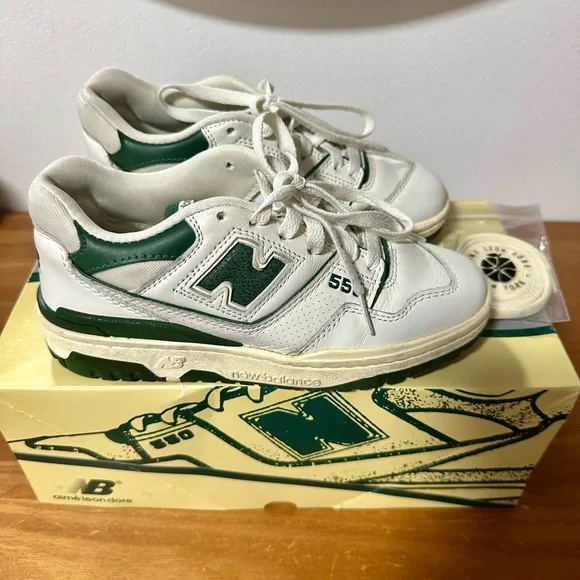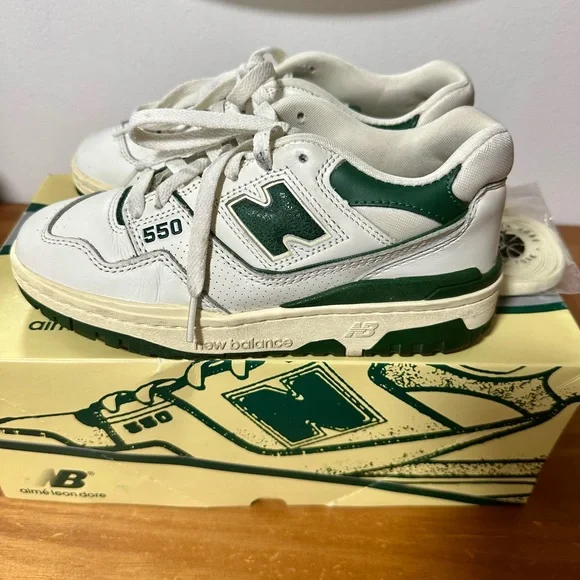 The New Balance 550 Aime Leon Dore in White-Green is a result of a partnership between New Balance and Aime Leon Dore.The shoe draws inspiration from the New Balance 550 and remains faithful to its predecessor by featuring a perforated leather upper and breathable mesh. This low-top basketball silhouette comes with a white upper paired with a green, cracked New Balance logo. The shoe sits on a pre-yellowed midsole, providing a vintage look.These sneakers are lightly worn/used Let me know if you have any questions