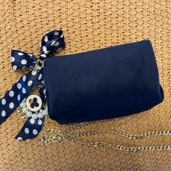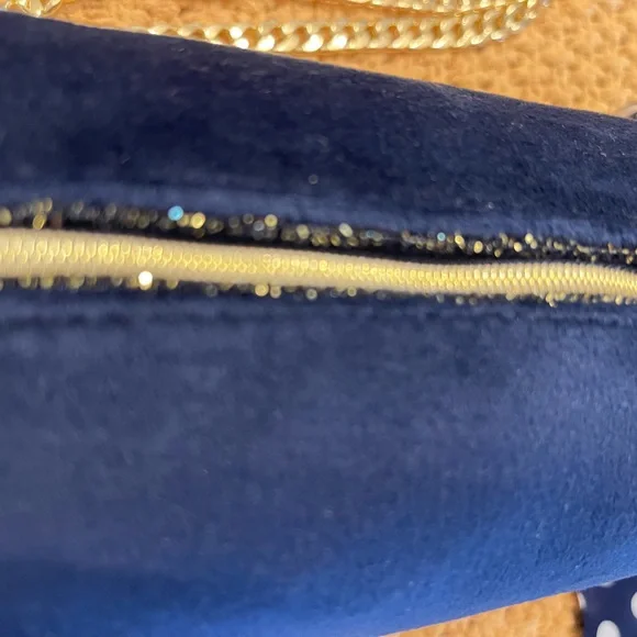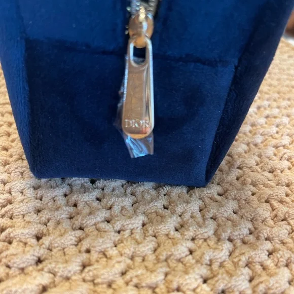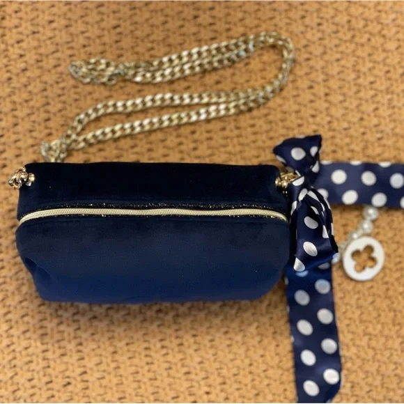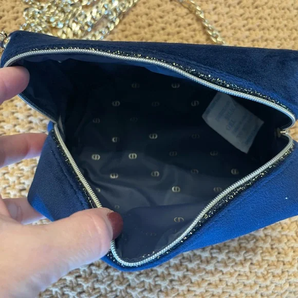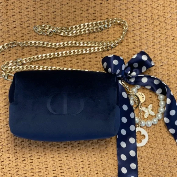 Authentic Dior navy blue velvet cosmetic bag repurposed as a beautiful crossbody/ shoulder/ wristlet/ clutch purse with gold accents on zipper. Plastic covered zipper pull. Gold brass hardware used for durability. Gold charm and blue with white polka dot scarf and pearl wristlet removable keychain. 47” flat golden chain that is removable along with keychain. NWOT. PERFECT CONDITION!Lining with “CD” logos in polyurethane. Perfect purse for anytime or event especially holidays! Eye catcher!Dimensions: 7” length X 5” deep X 3” wide