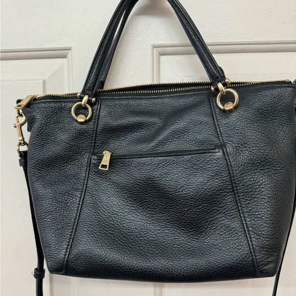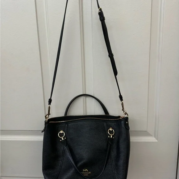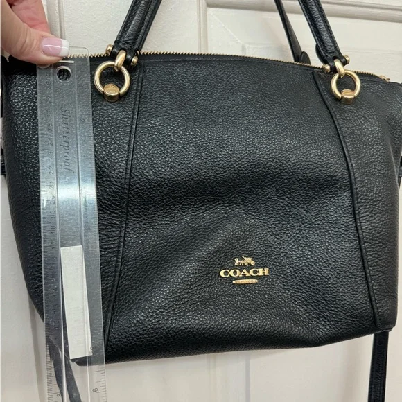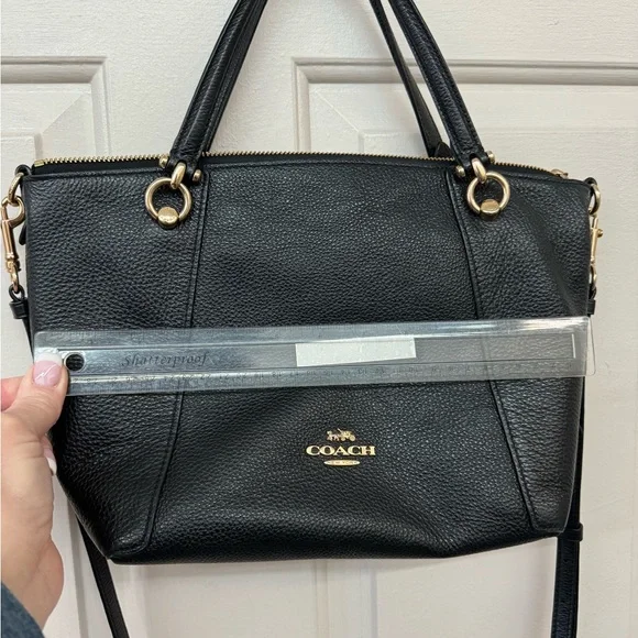 Coach Kacey Satchel, black with gold hardware. Zip top enclosure with one back exterior and one interior zipper pocket. Shoulder Strap included.Style C229
