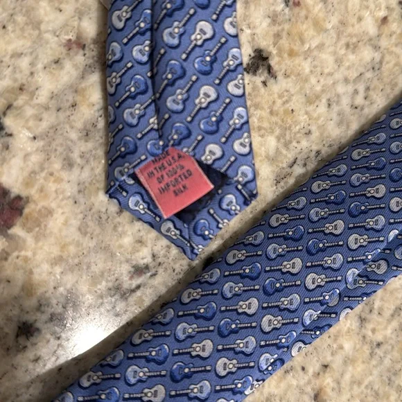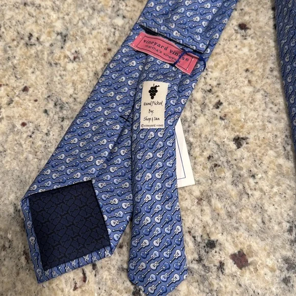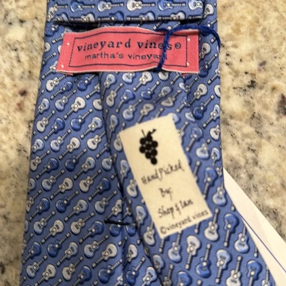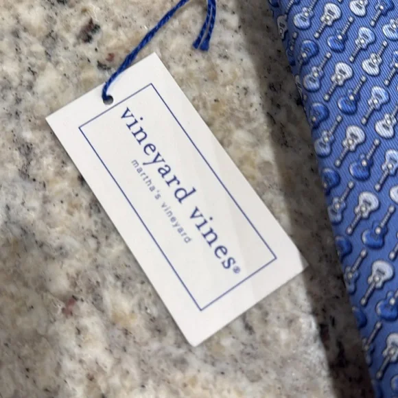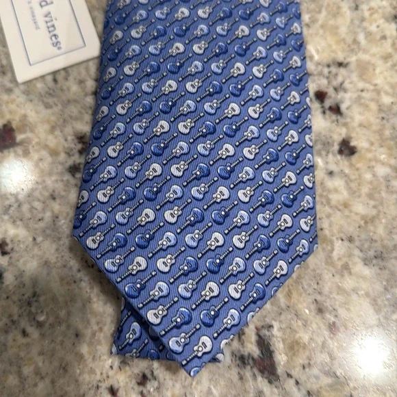 This amazingly cool tie from Vineyard vines features different shades of blue guitars. Perfect for the musical enthusiast in your life. Made of 100% silk, this is a fantastic gift for you or a friend. New with tags.