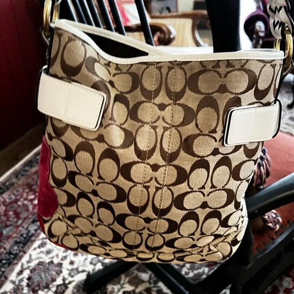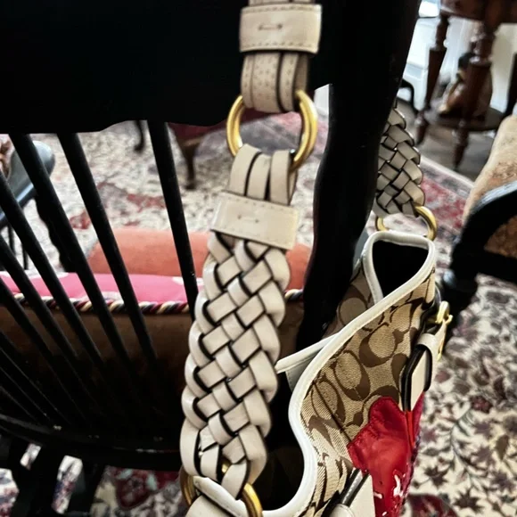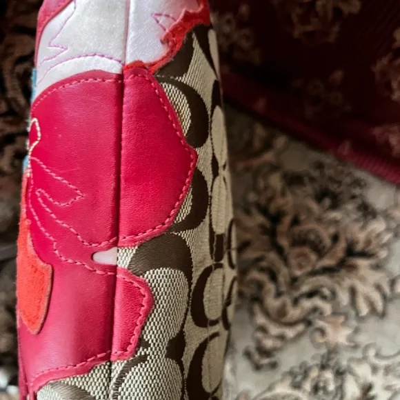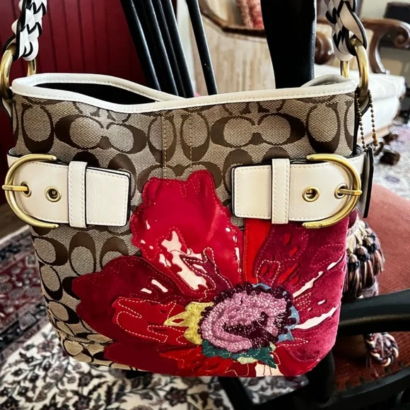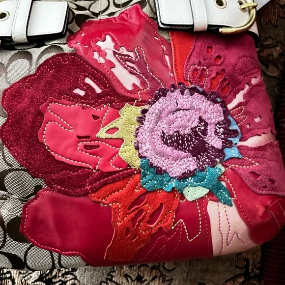 This is a gorgeous hard to find Vintage bag. Measuring 11 X 10 inches. Braided leather handle. Original CC exterior with a custom suede and leather flower. This bag has a lot of detail. There is one scuff on the underside of the handle ( as pictured). And the interior pocket needs some stitching. It was only worn a couple of time. Snap closure. Thanks for looking!