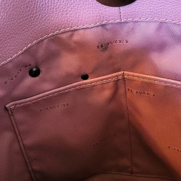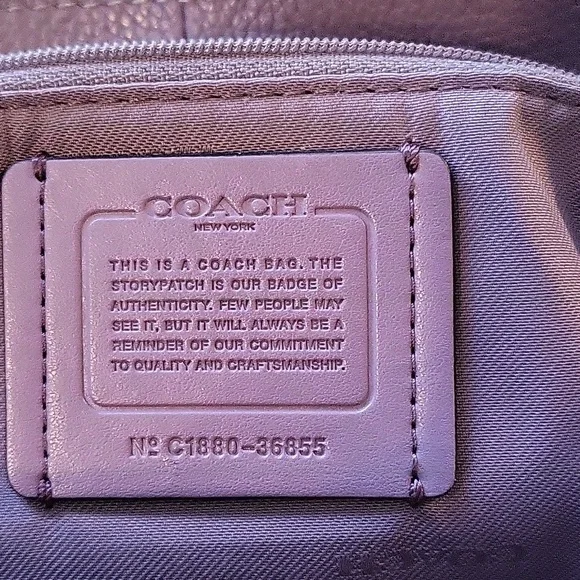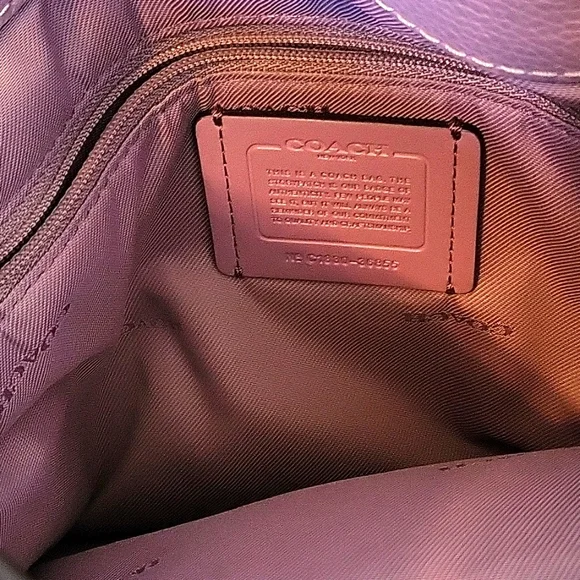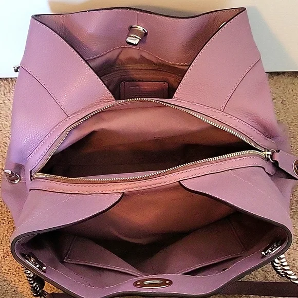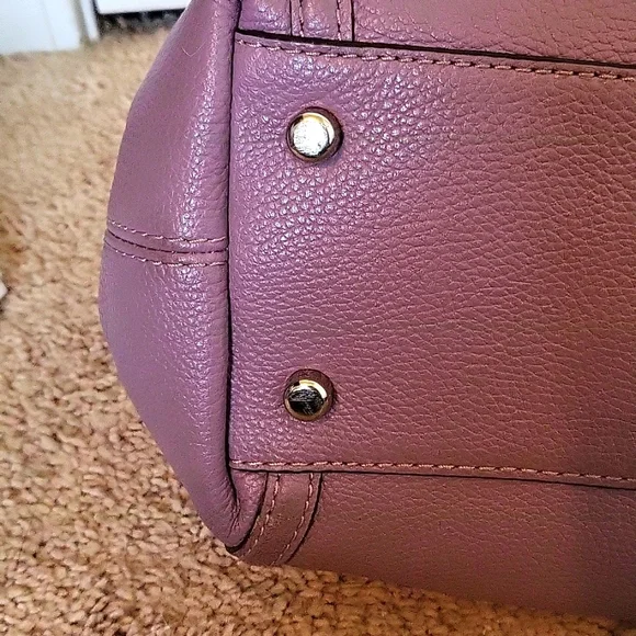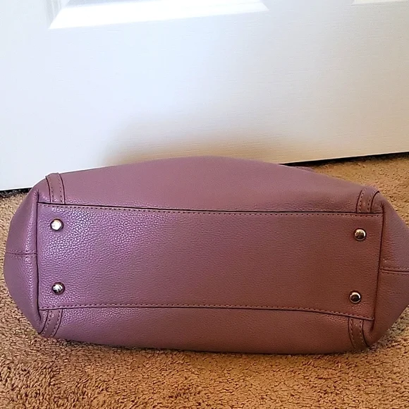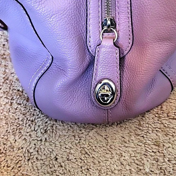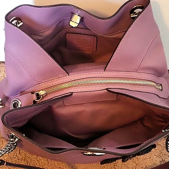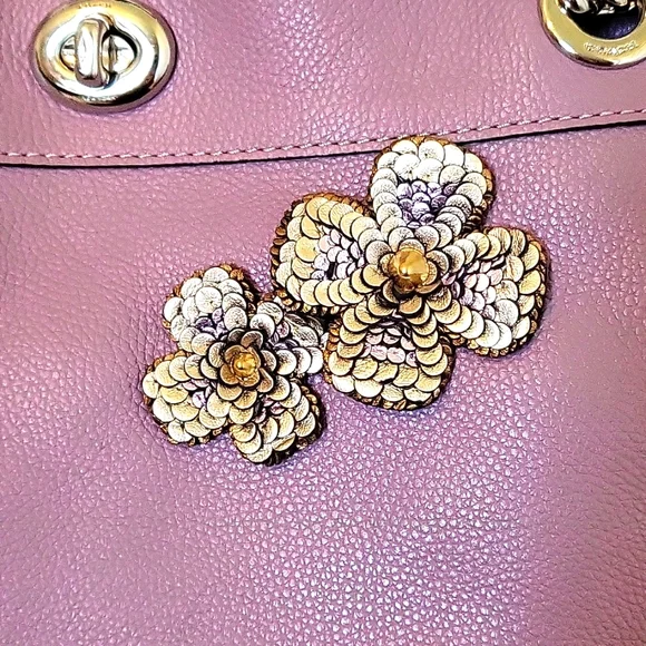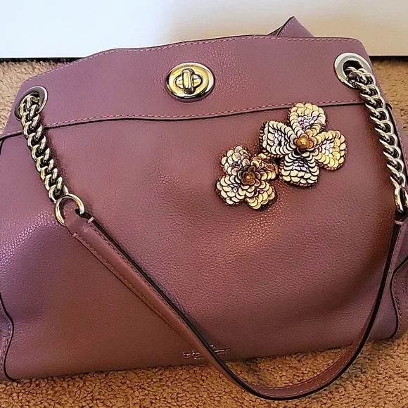 custimized, turnlock shoulder bag, Dusty Rose color, Pebbled leather, Silver tone, 1 center zip pocket, 2 interior slip pockets, 1 interior zip pocket, 12 3/4" (L), x 11" (H), x 6" (W), (2) Purple, silver and bronze customization flowers on outside, very gentle used, looks excellent. no dustbag.