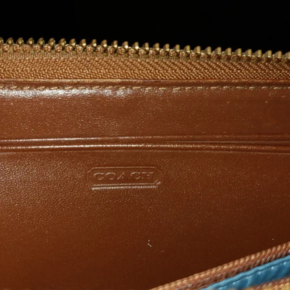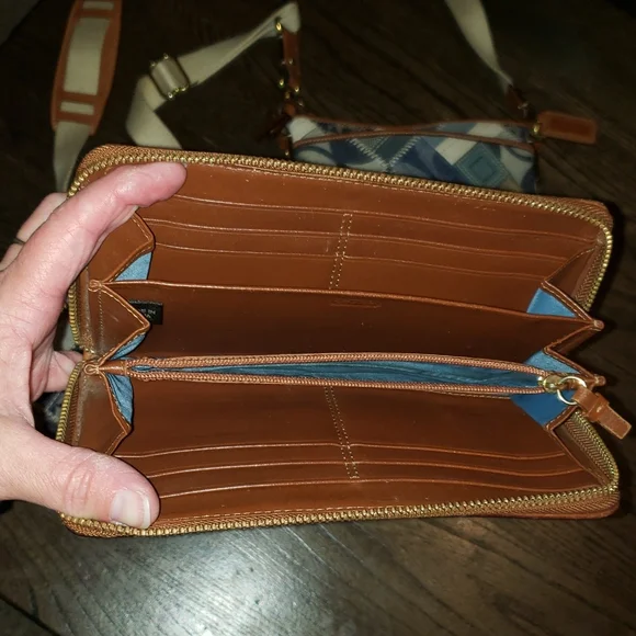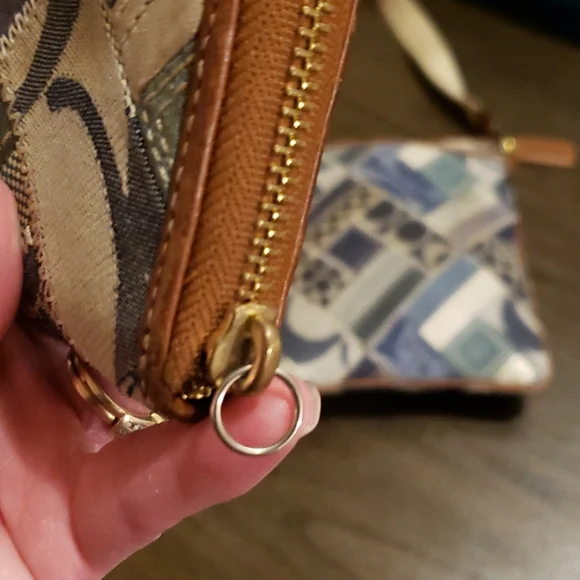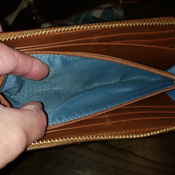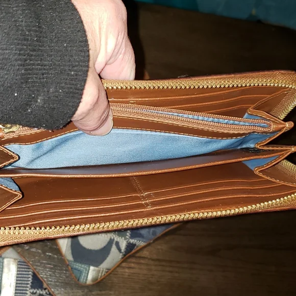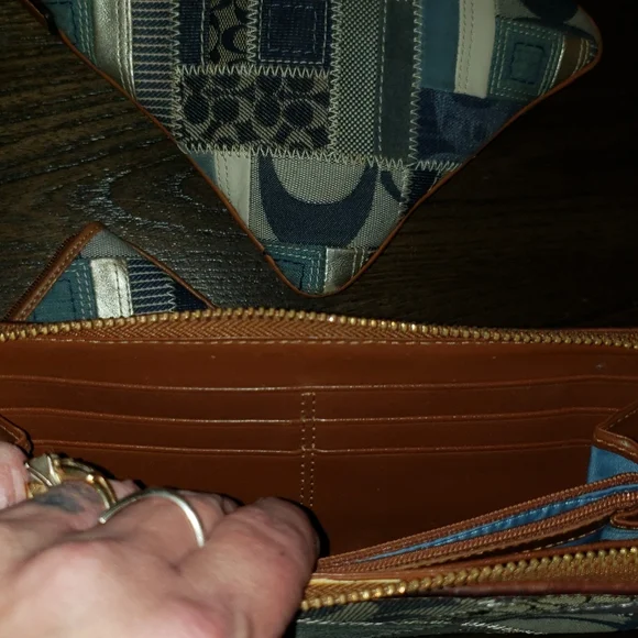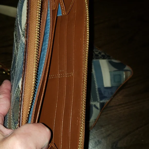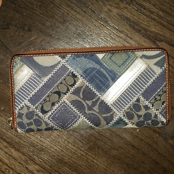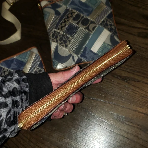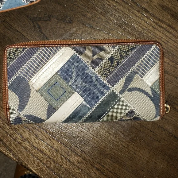 Denim patchwork mahogany leather wallet with metallic silver, stitching detail & mahogany leather trim & detail. full zip around with fully functional zippers. Brown zipper. Zipper pull ring present without leather pull. Approximately 8L X 4.5Hzippered coin pocket 12 card slots3 slip pocketsNever used only stored for several years so there is some wear (rubbing on metallic silver areas). No major flaws or known rips, holes etc.*WALLET ONLY* CROSSBODY & WRISTLET SOLD SEPARATELY *