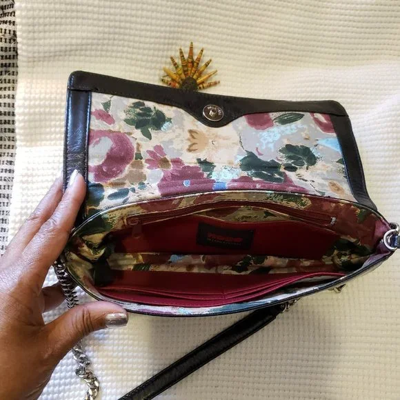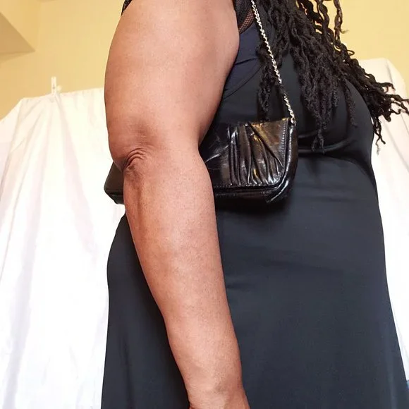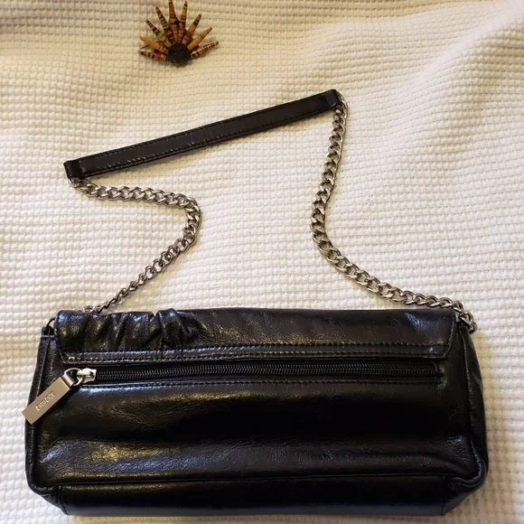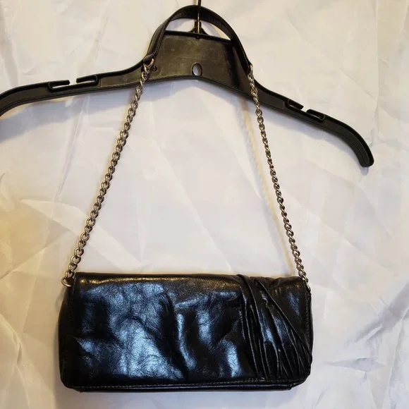 This aging gracefully oblong black beauty has a magnetic closure, ruched leather on left front side, 4 inside card slots and 4 compartments, one back zipper pocket, an attached chain/leather nonadjustable shoulder strap.Minimal signs of wear on edges, but no tears or holes anywhere.